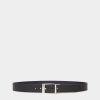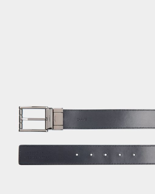 Adjustable and reversible, the Astory 35mm belt is crafted from black and navy blue leather. The clean lines of the polished ruthenium-hue metal buckle ensure its versatility.