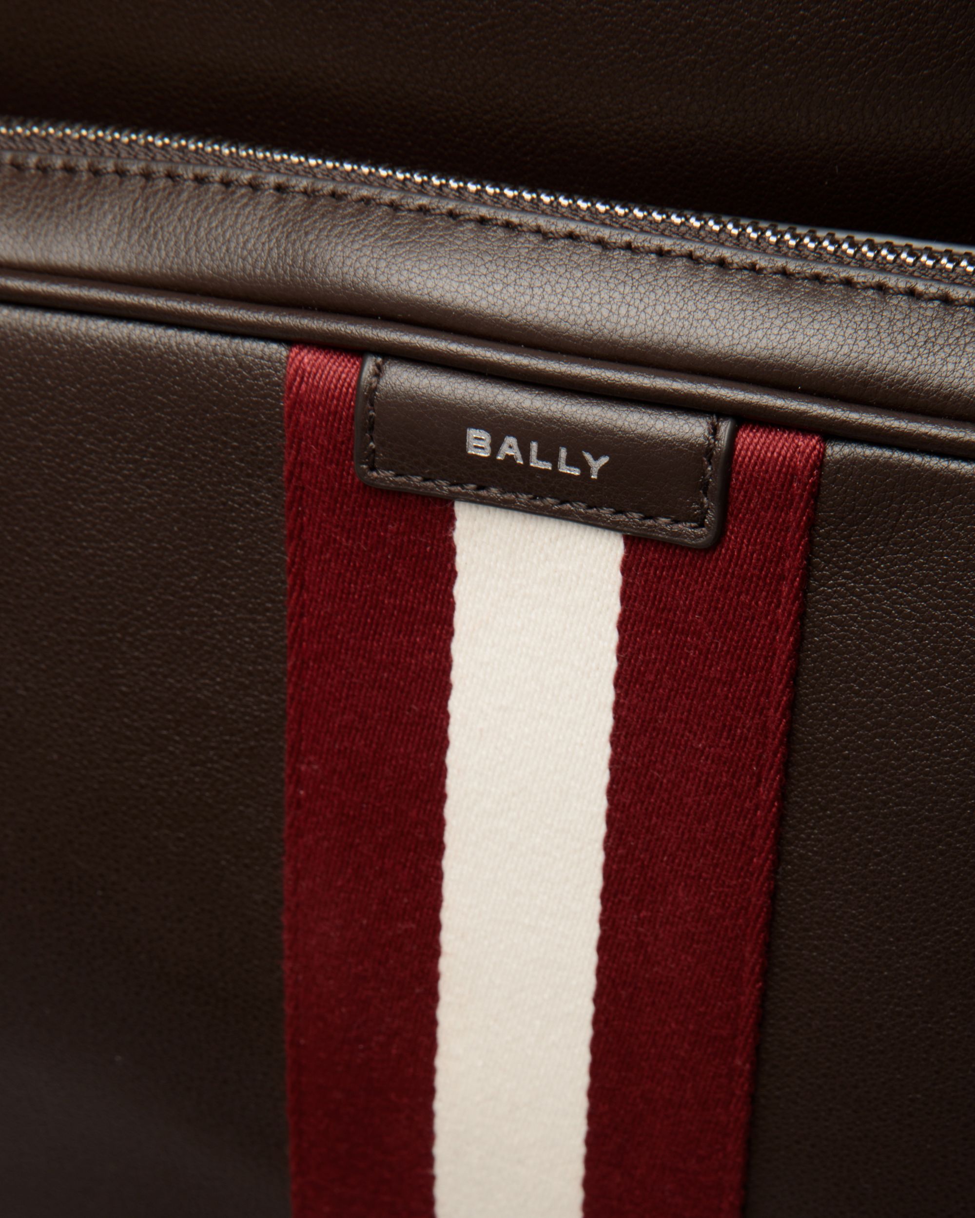 In Ebano calf leather, this Code backpack has an essential silhouette composed of a spacious main compartment and a front zip-around pocket. A red and white Bally Ribbon in grosgrain ensures an iconic note.