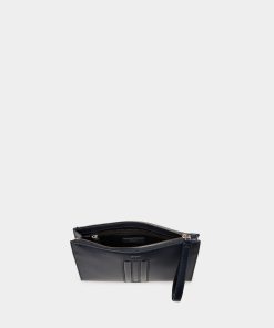 This Mythos pouch is designed into a classic silhouette and crafted from navy blue recycled leather. The wrist loop doubles as the puller of the zipper along the top, in leather that matches the intarsia Bally Ribbon at the front.