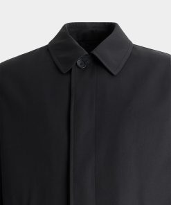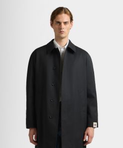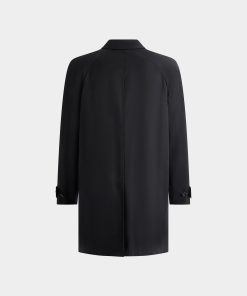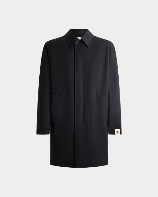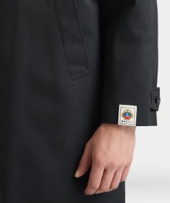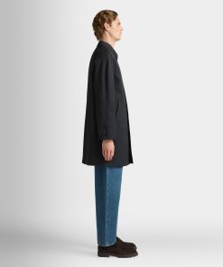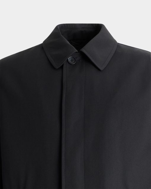 Navy blue car coat in smooth cotton-polyester gabardine with a water-resistant finish and light padding for warmth without bulk. A Bally Crest label trims the left cuff.