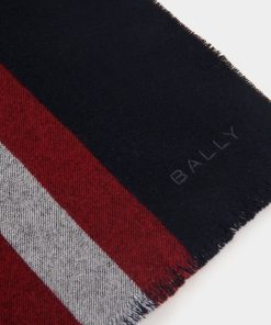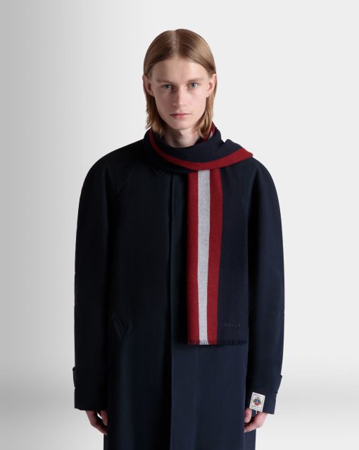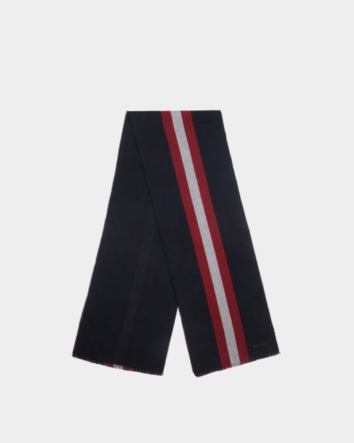 A jacquard-knit Bally Ribbon in red and white extends down the center of this scarf in navy blue wool.