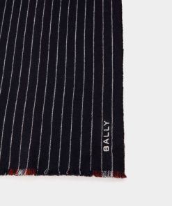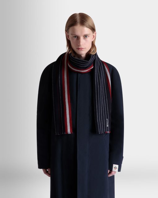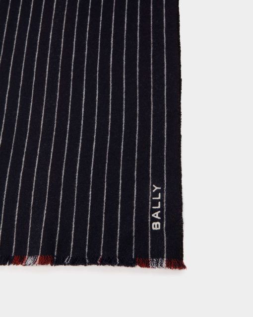 This navy blue wool scarf has a Bally Ribbon motif on one side and fine pinstriping on the other.