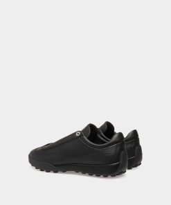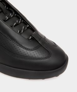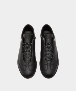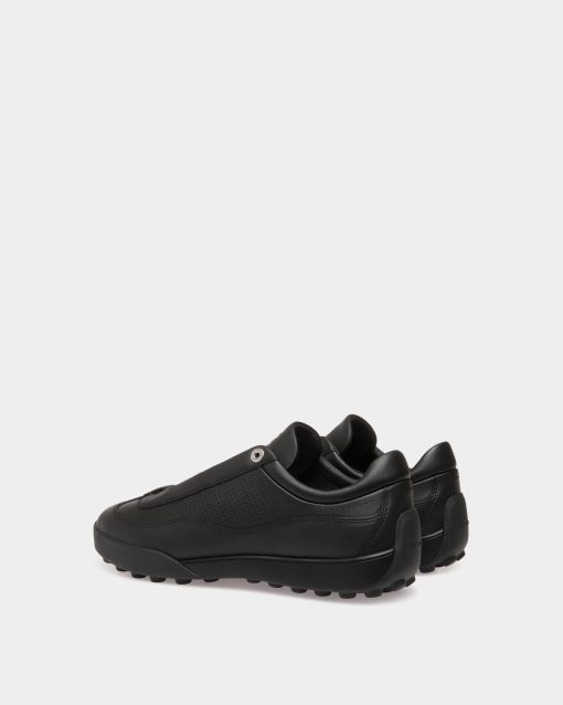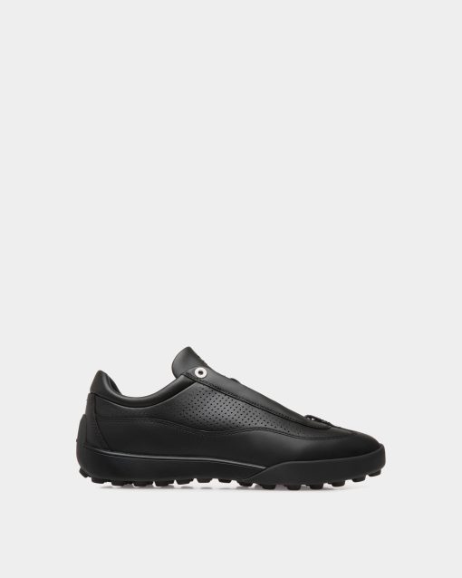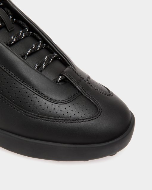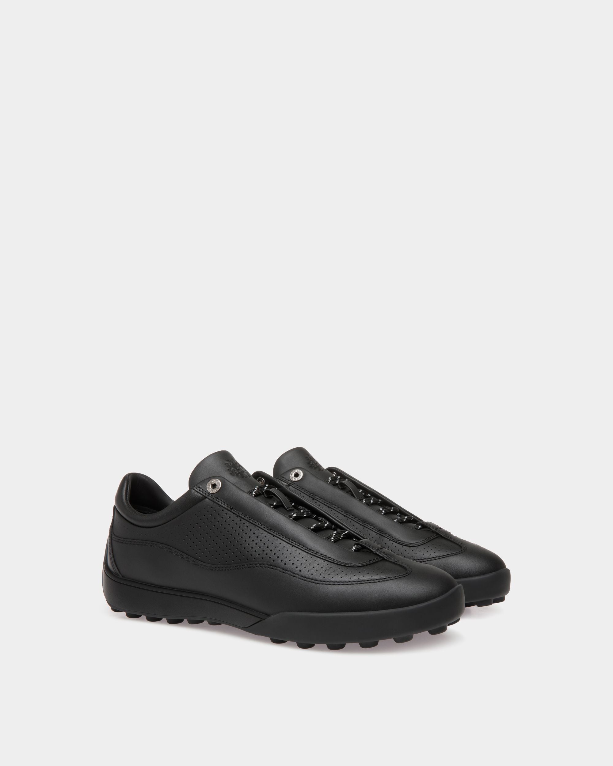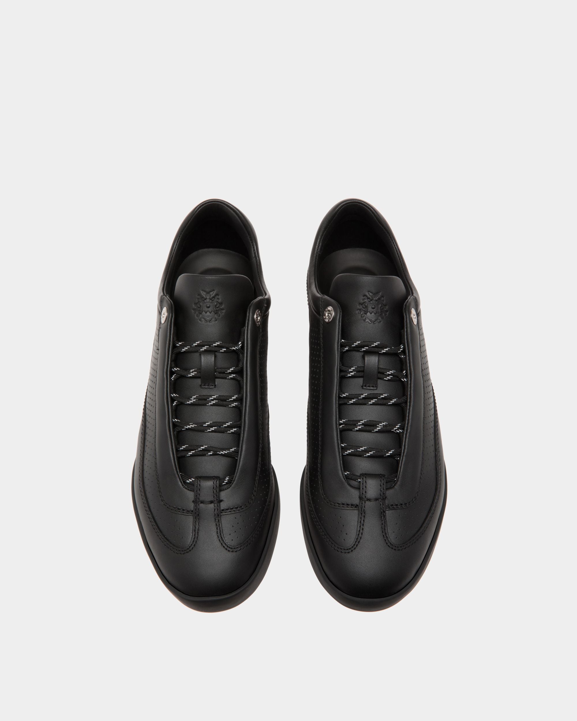 The Manto sneaker in black leather features a sleek perforated upper and a concealed eyestay with round woven laces. A Bally Crest on the tongue ensures an iconic finish.