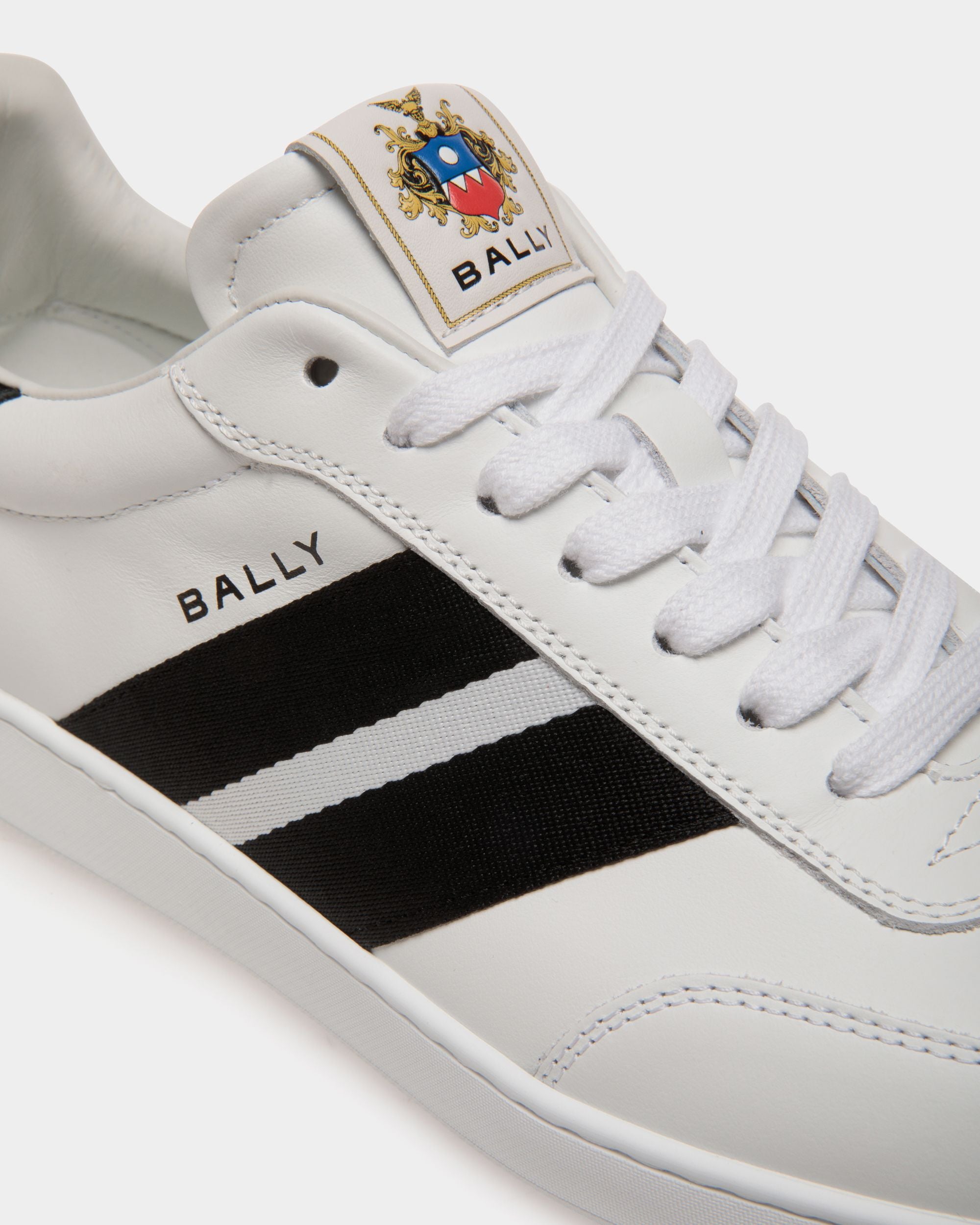This lace-up Retro Crest sneaker in calfskin is characterized by a timeless black and white design, enriched by a leather Bally Crest label for an iconic note. The rubber cup sole ensures all-day comfort.