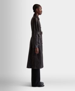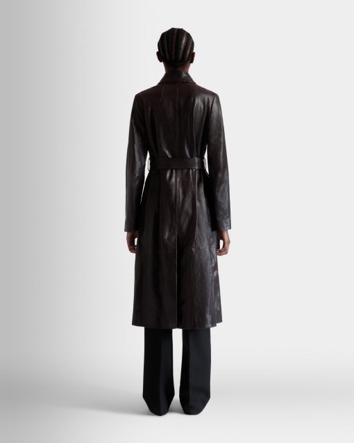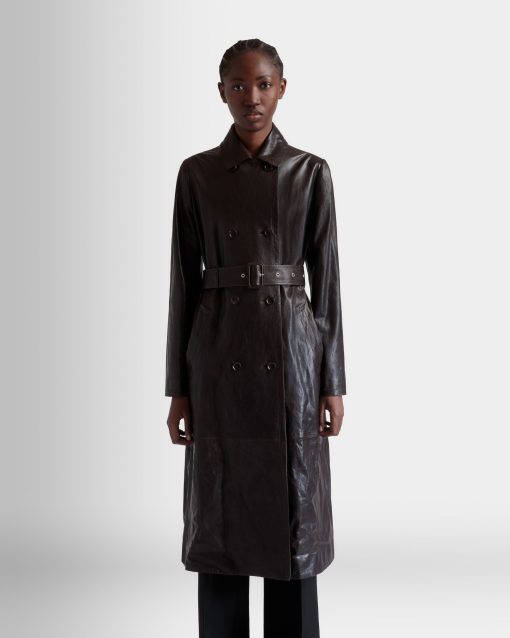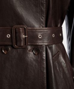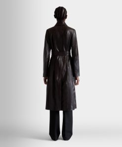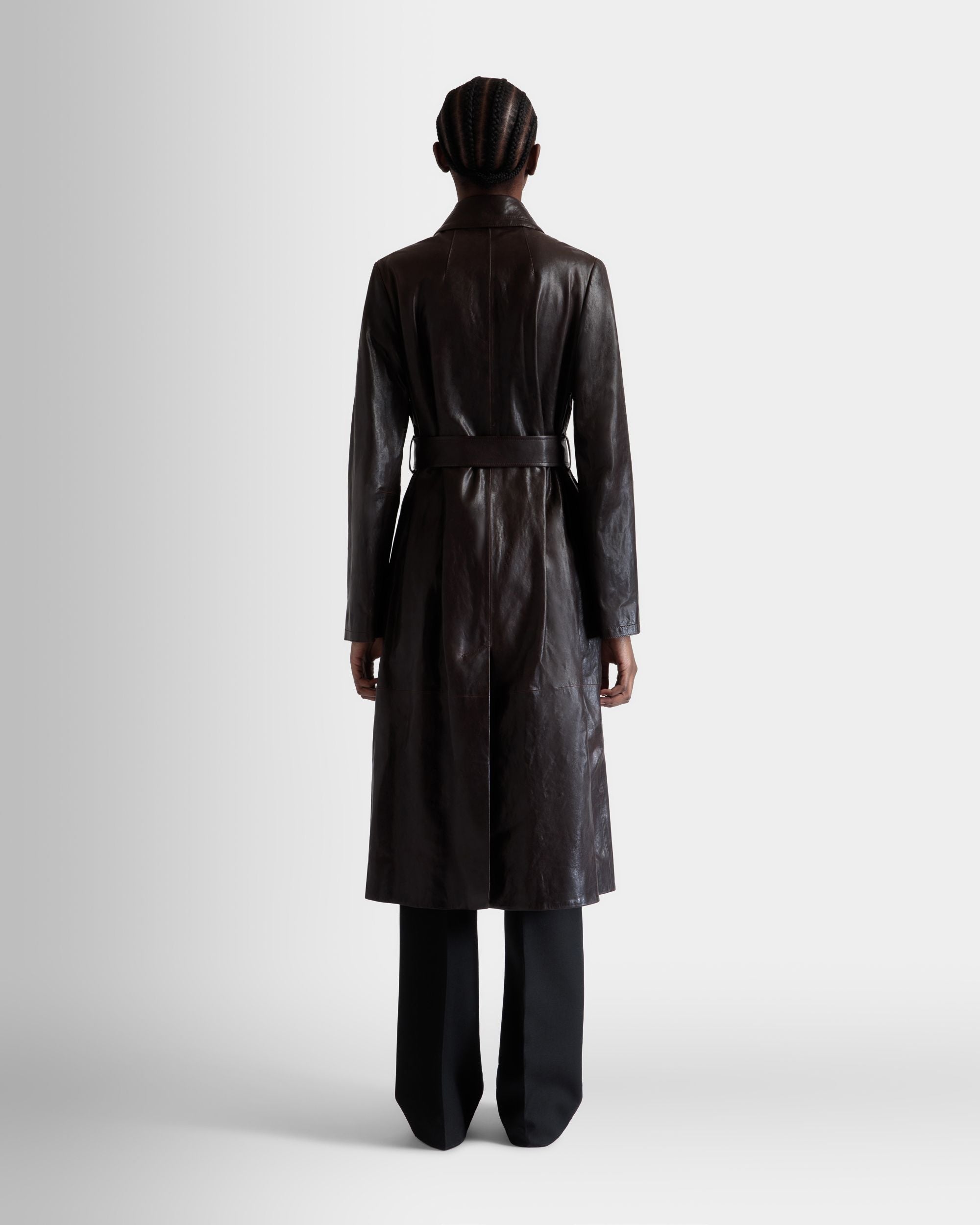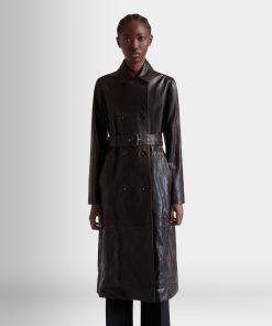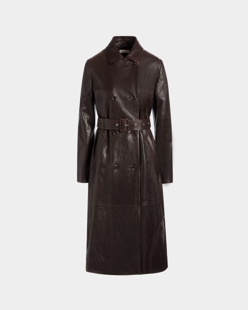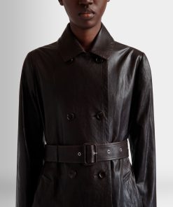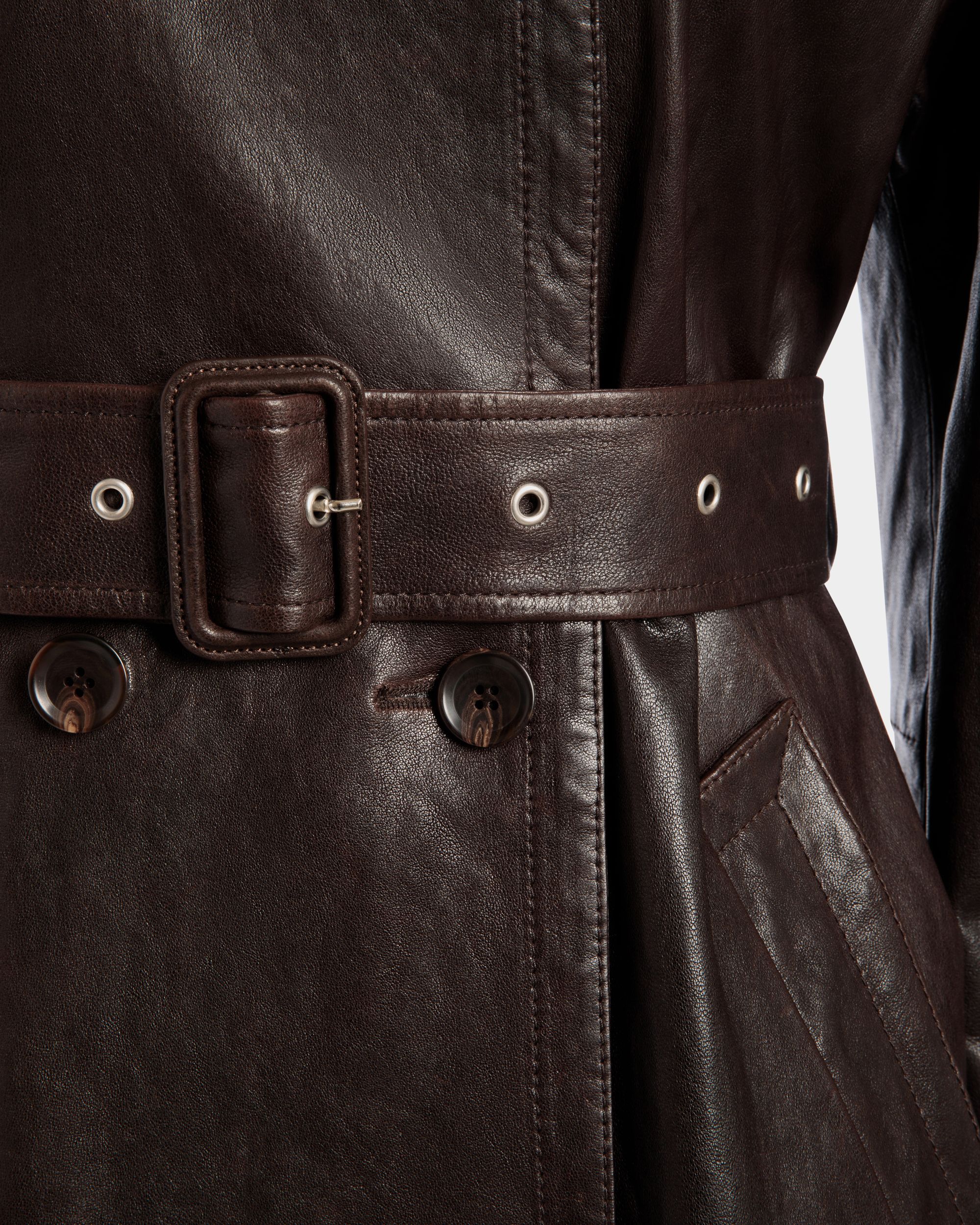 This double-breasted coat is designed in Ebano lambskin with a soft, supple handle. The front is fastened by horn-effect resin buttons and completed by a leather belt.