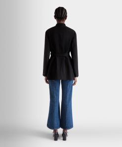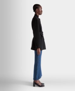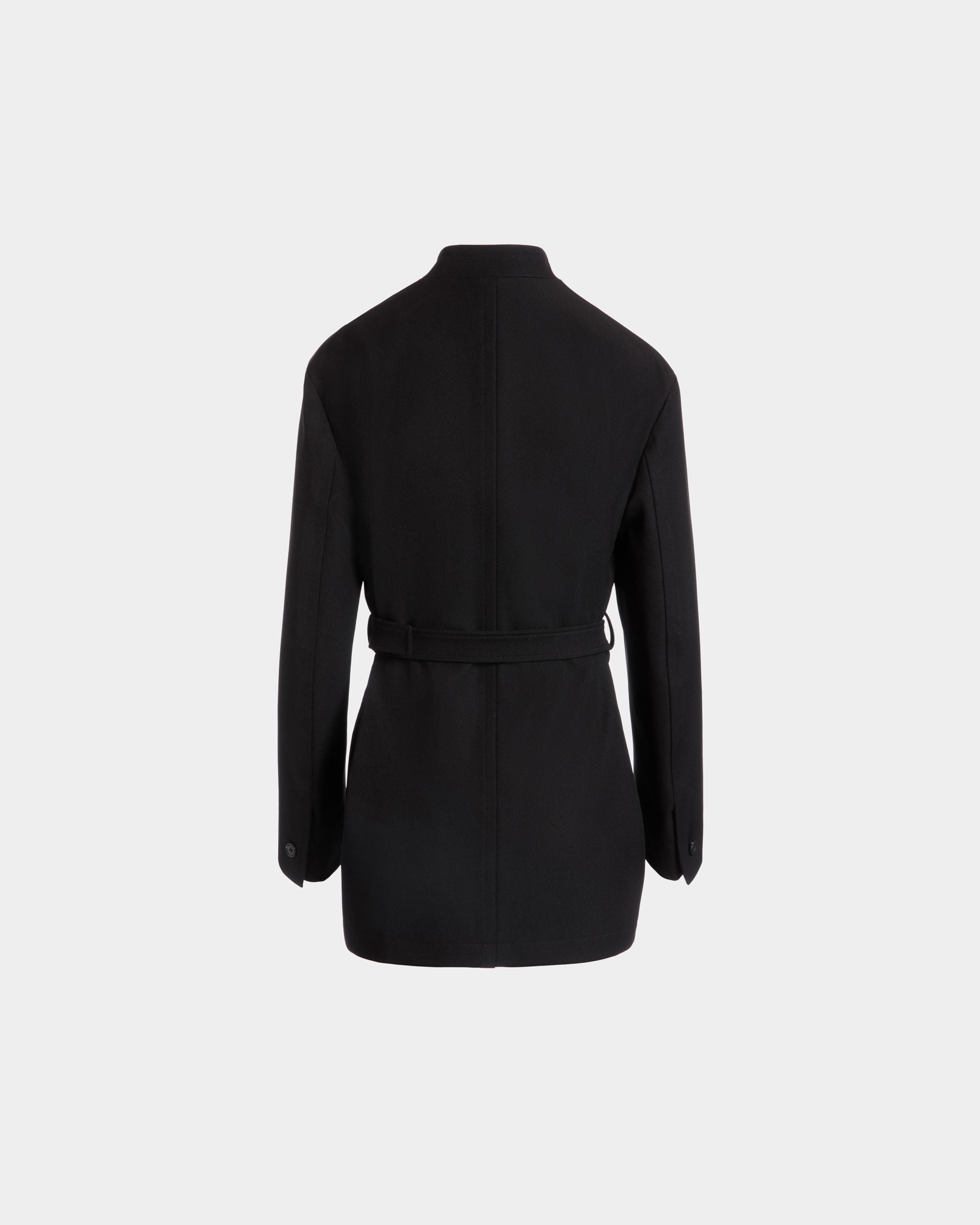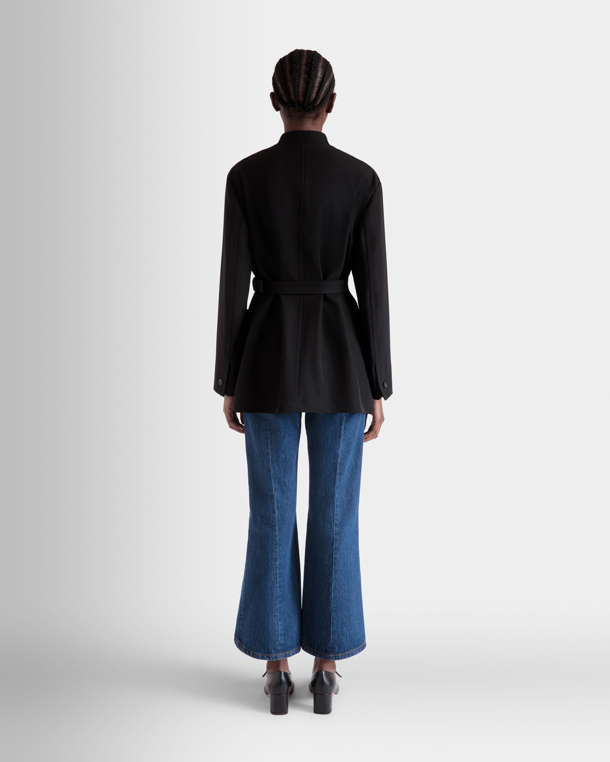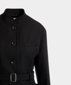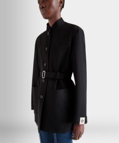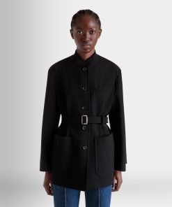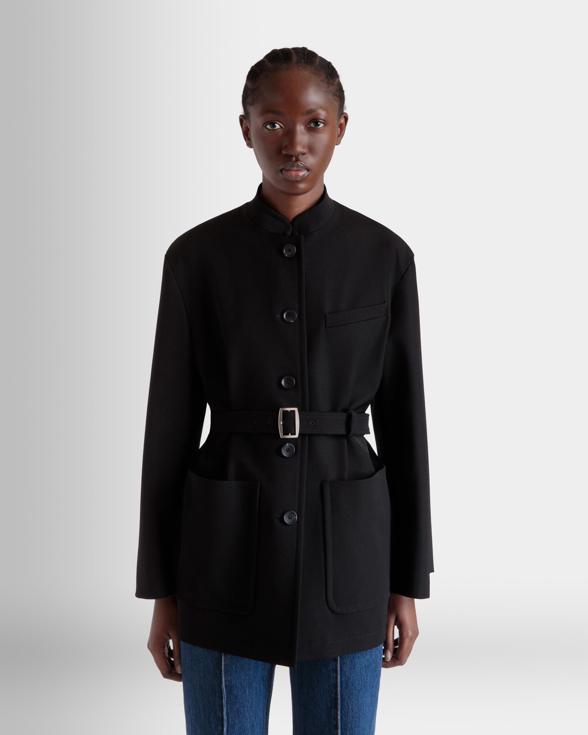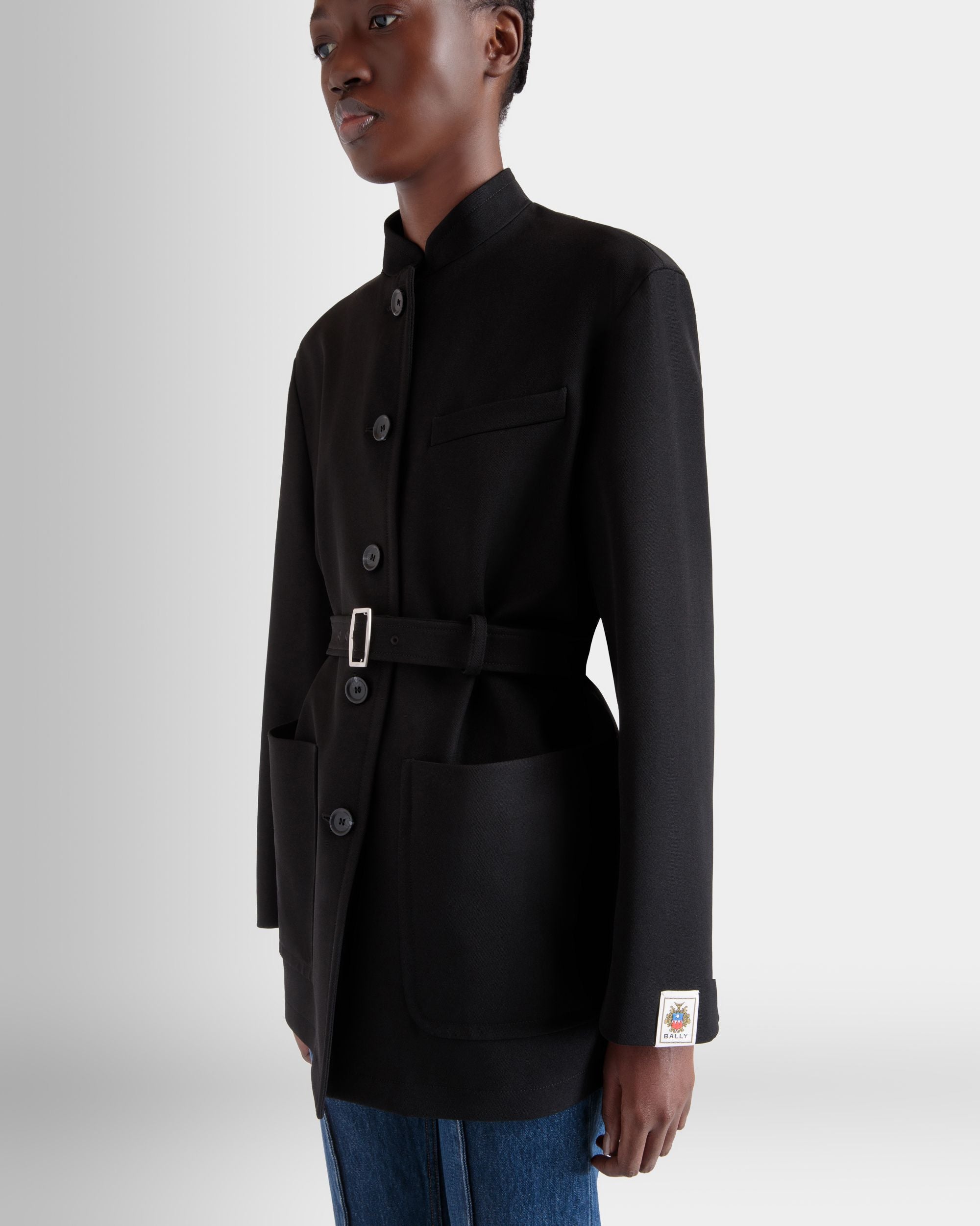 In black nylon gabardine, this mandarin-collar jacket features a belt to adjust the silhouette and large pouch pockets on the front.