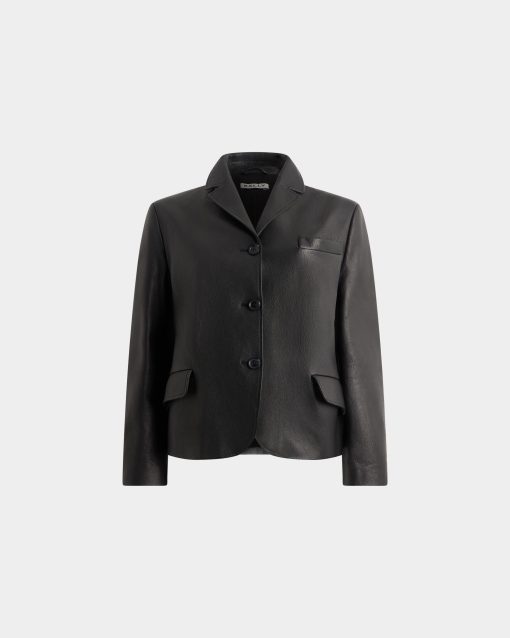 This black leather blazer with a notch collar is in finest kidskin with a grained finish. Three horn-effect buttons in tone-on-tone resin fasten the front.