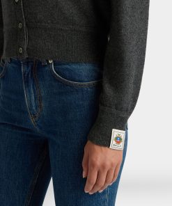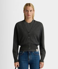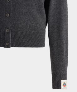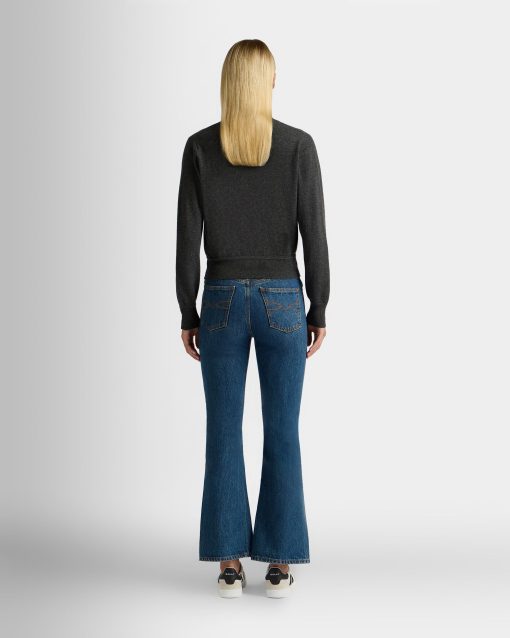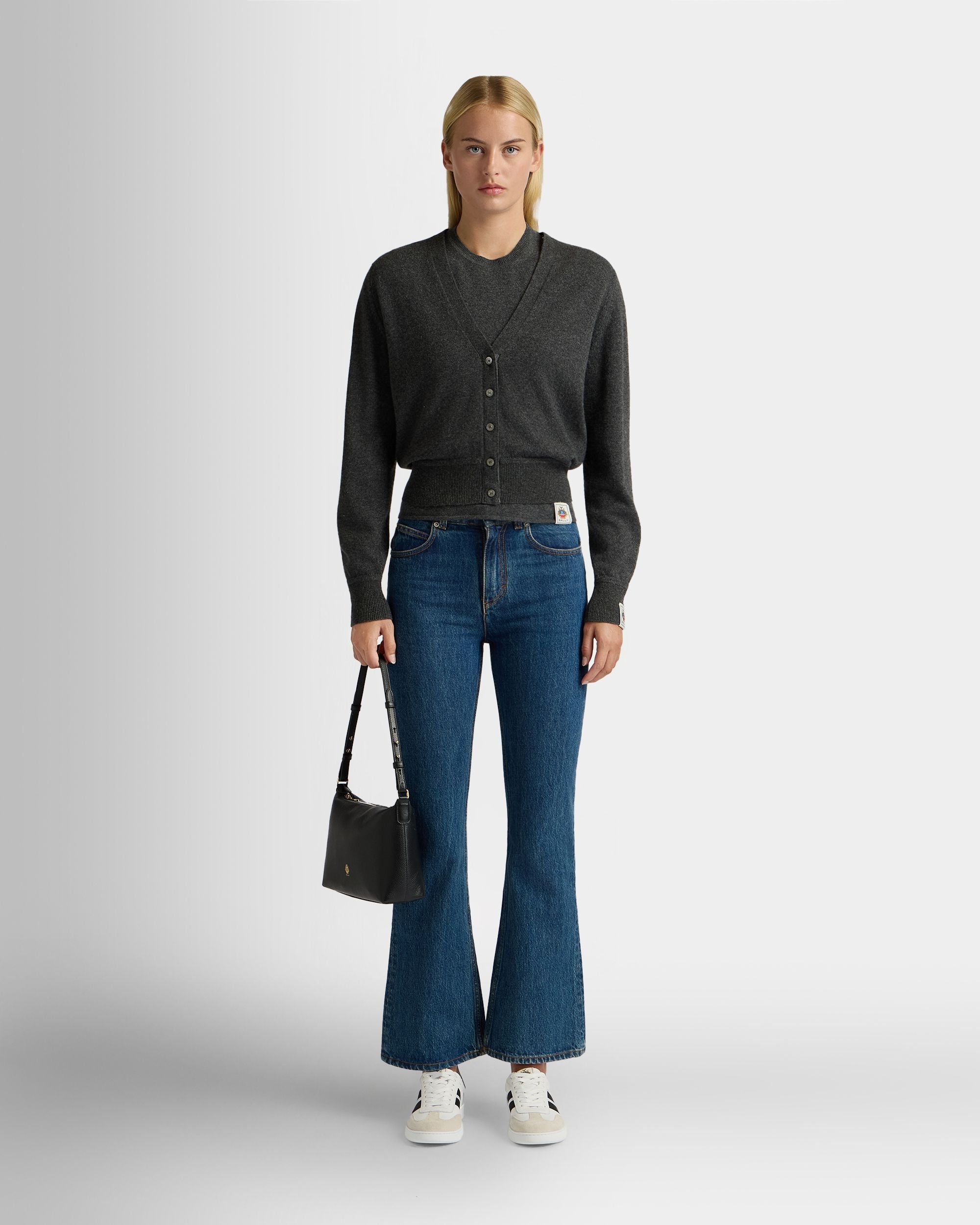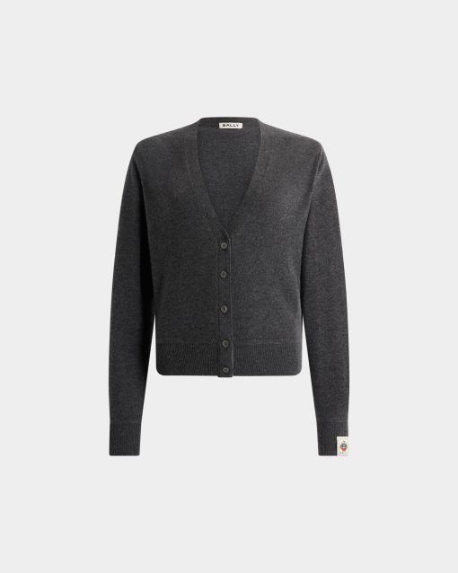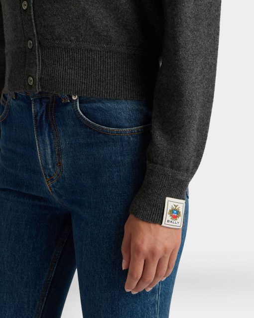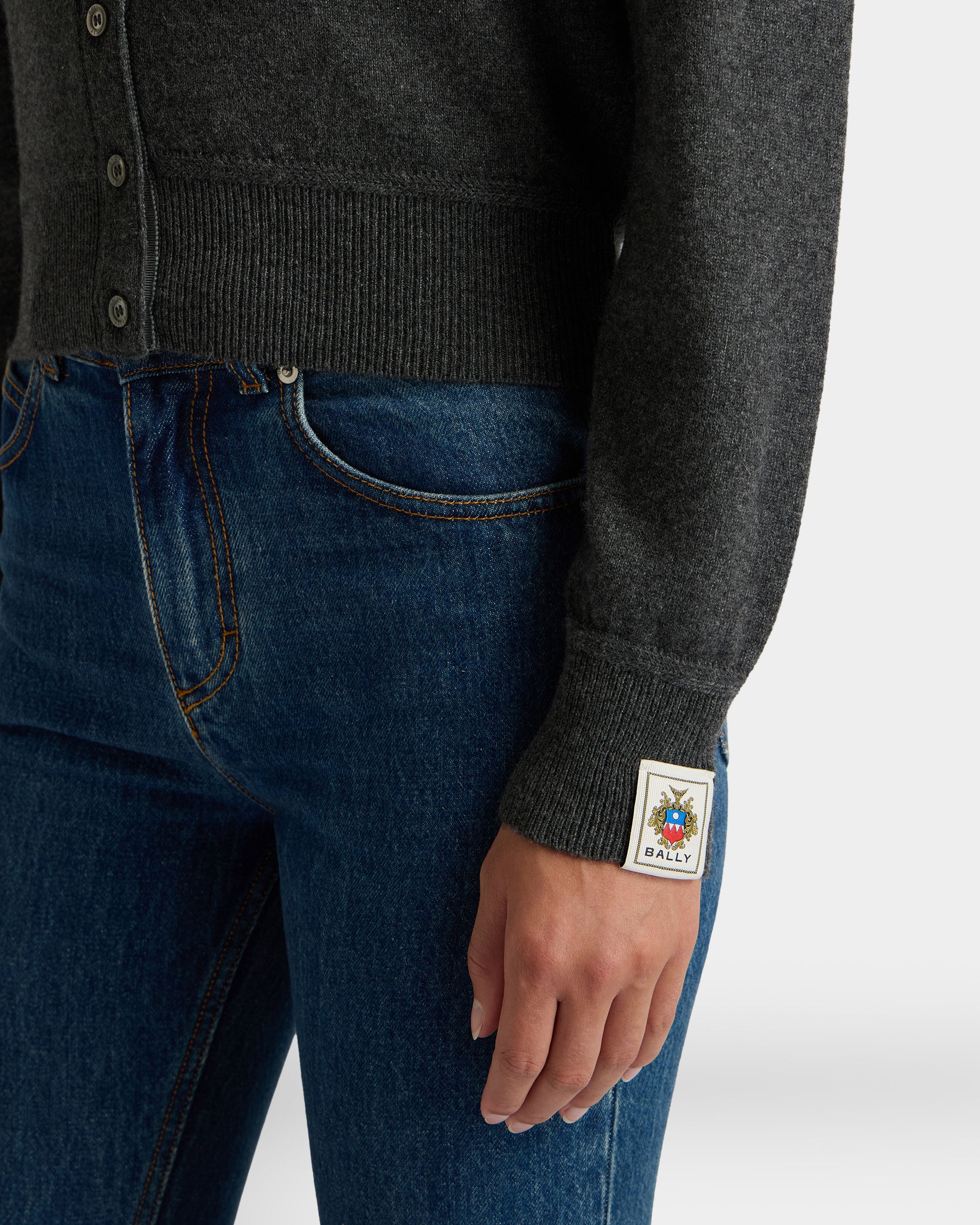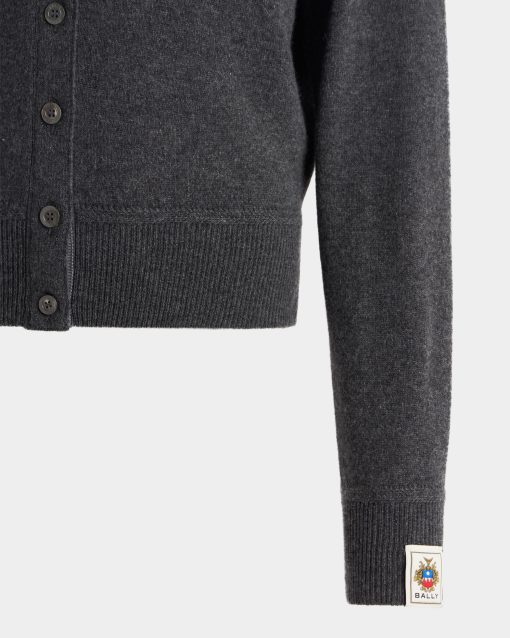 This dark grey cardigan in soft cashmere has a deep-V neckline and five buttons with the Bally logo to the front. A Bally Crest label decorates the left cuff.