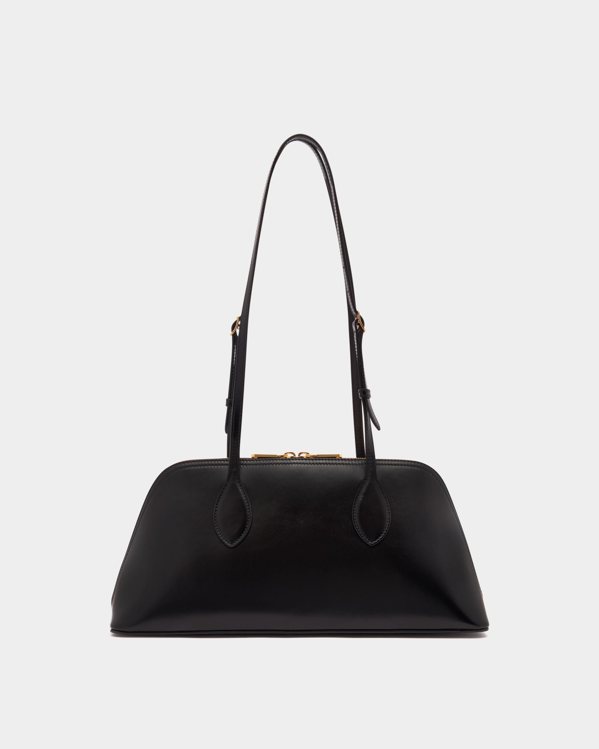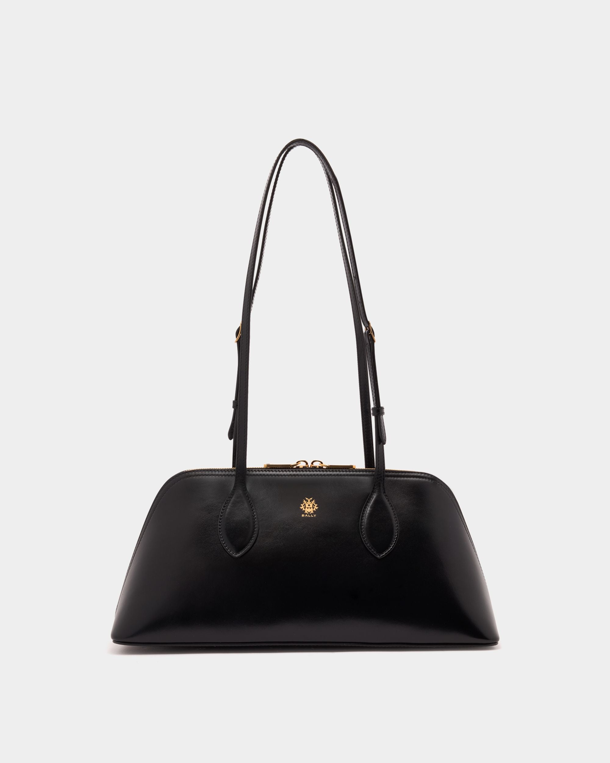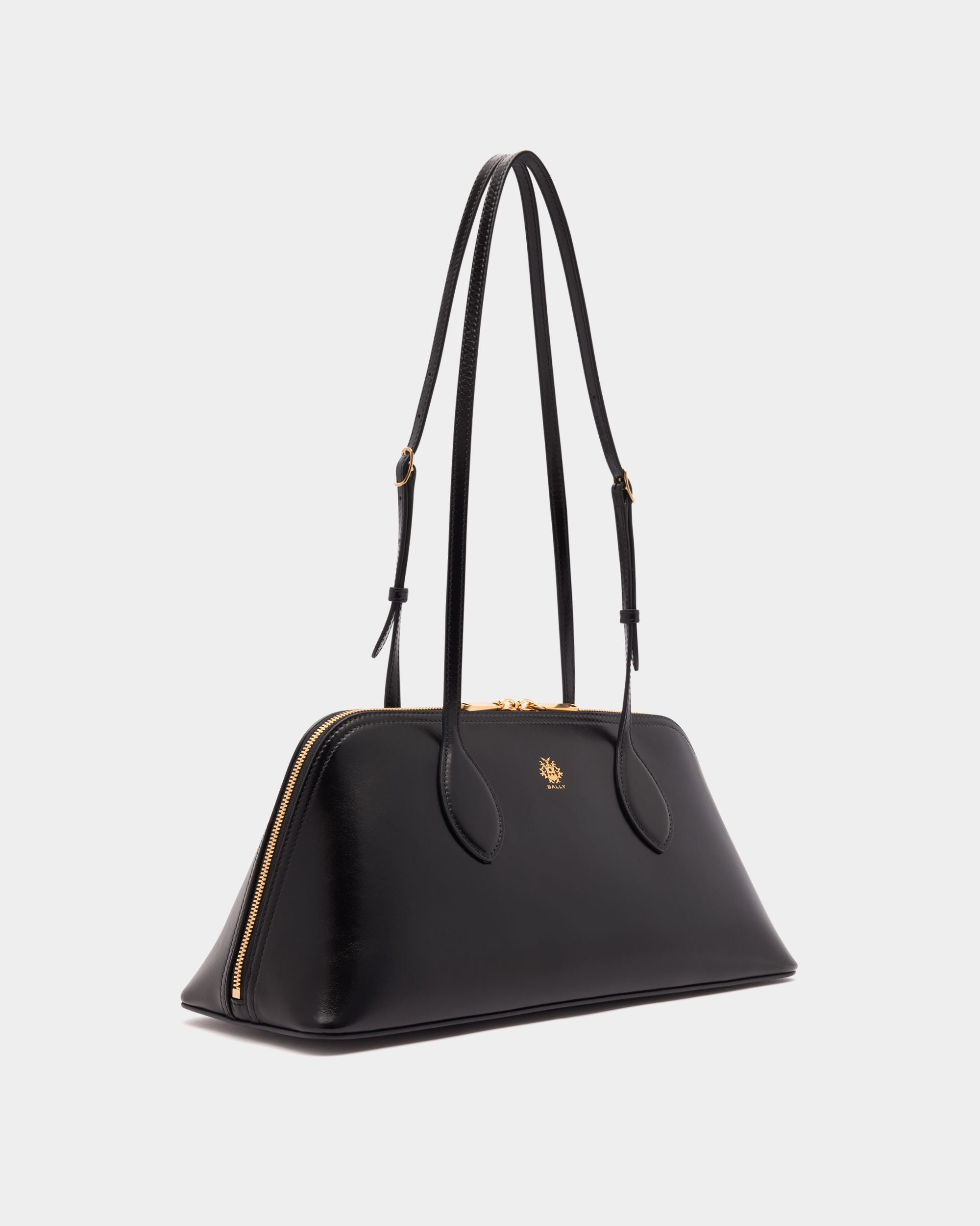 The trapezoid silhouette of the Praline shoulder bag in black leather is carried by two adjustable straps and closed via a two-way zipper. A Bally Crest in gold-tone foil embellishes the front, a timeless signifier of Bally’s Swiss heritage.
