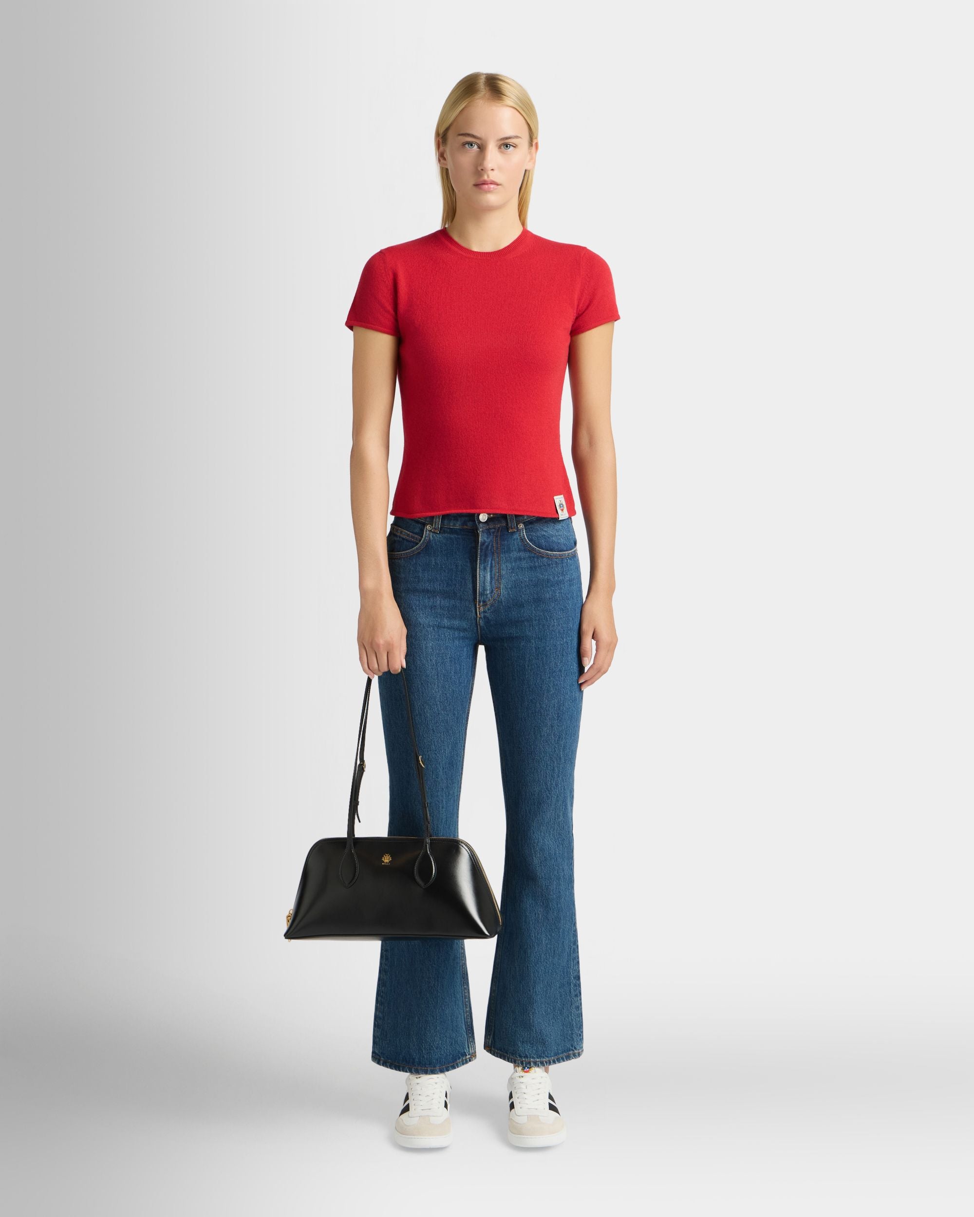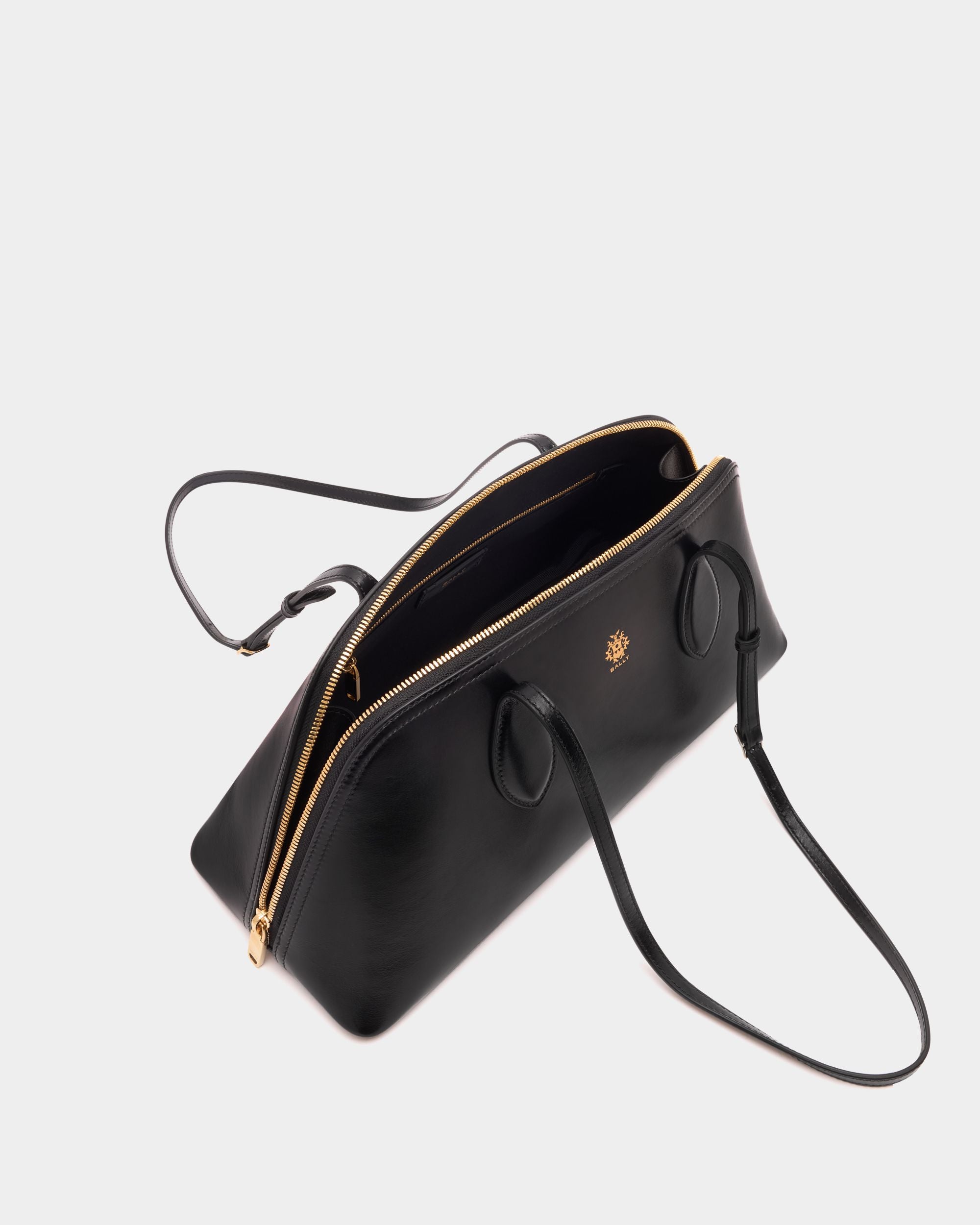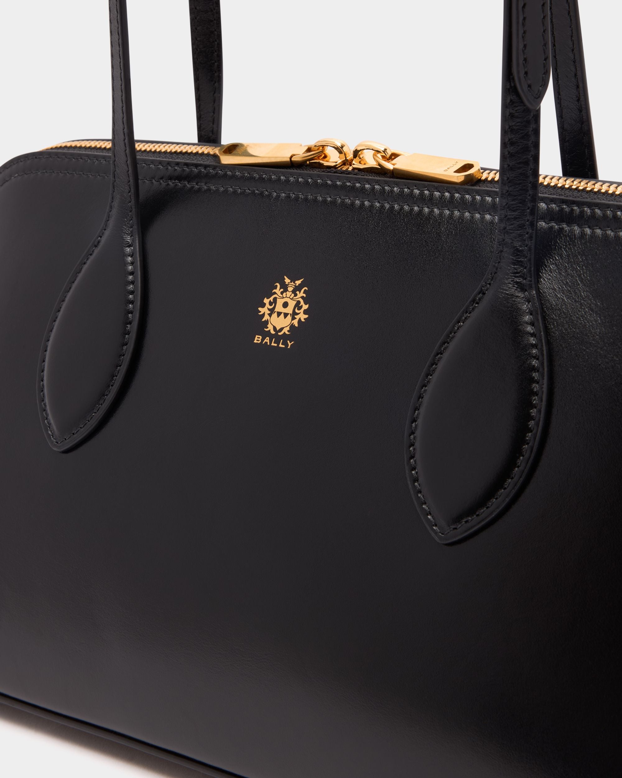 The trapezoid silhouette of the Praline shoulder bag in black leather is carried by two adjustable straps and closed via a two-way zipper. A Bally Crest in gold-tone foil embellishes the front, a timeless signifier of Bally’s Swiss heritage.