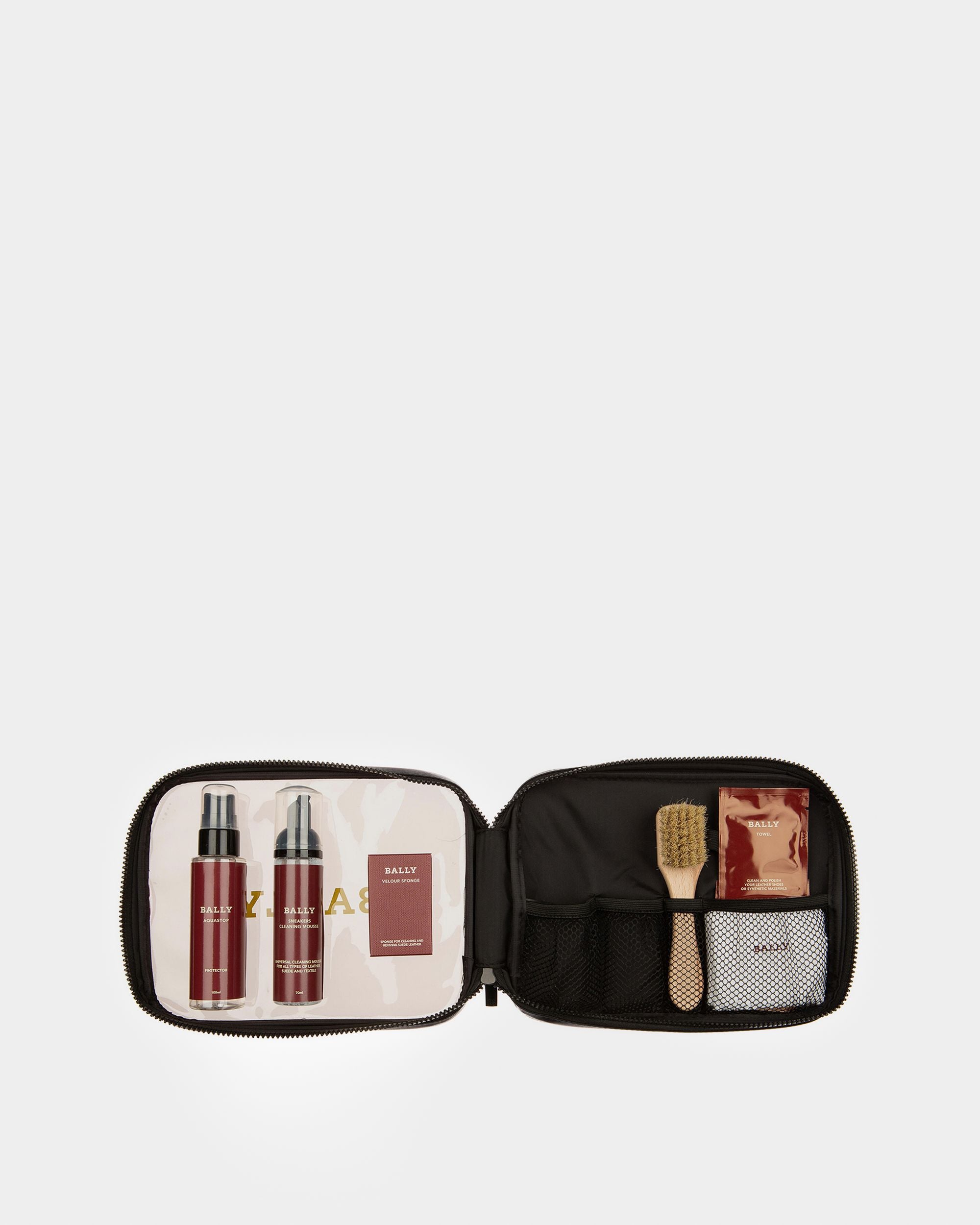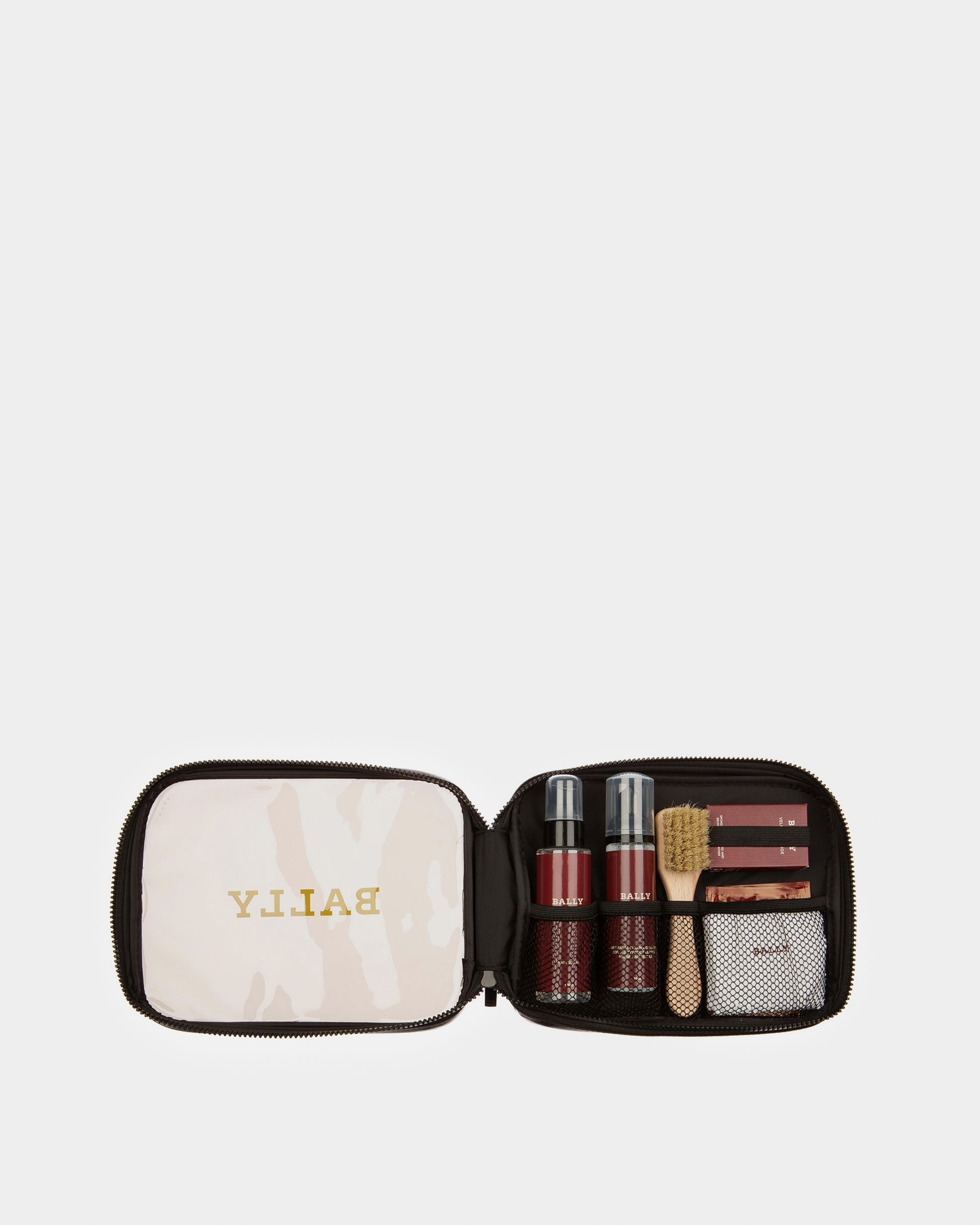 This compact shoe care travel kit in black houses accessories for keeping shoes clean when on the go. Included are a colourless Aquastop treatment used to protect leather, suede and fabrics against dirt, damp and stains, a double sided towel with a rough side for tough stains and a soft side for general cleaning, 12 wipes, a velour sponge for cleaning suede and nubuck, a whitening cream for keeping white sneakers looking box fresh and a brush.