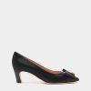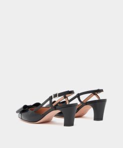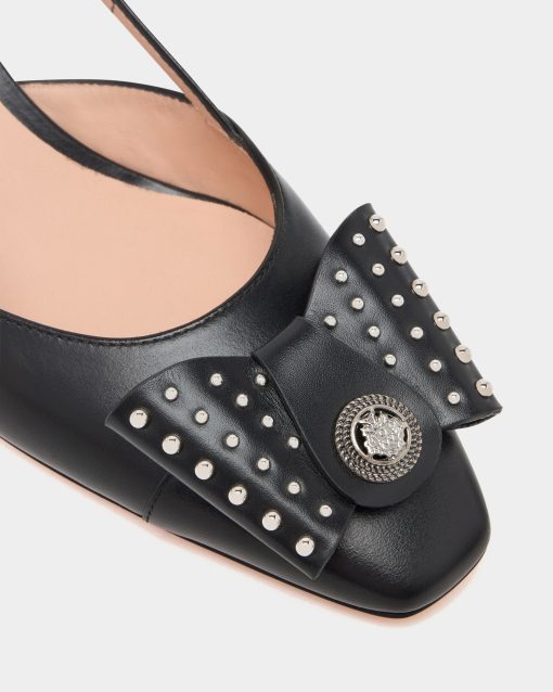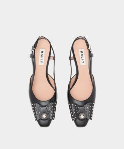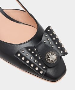 In black leather, this B-Bow slingback was inspired by a 1989 design from the Bally archives. The delicate square toe is finished by a large grosgrain bow with metal studs and a Bally Crest in metal at the center.
