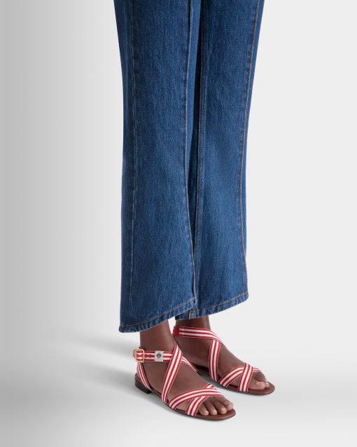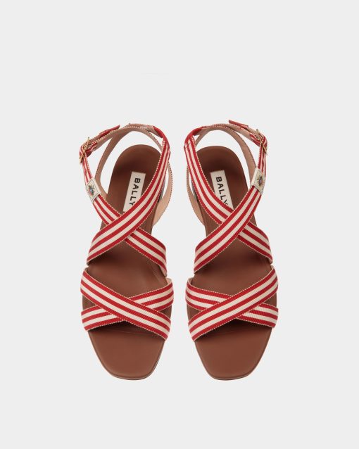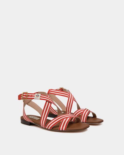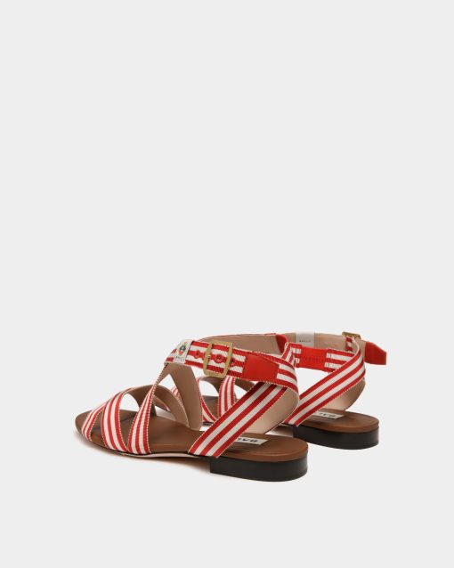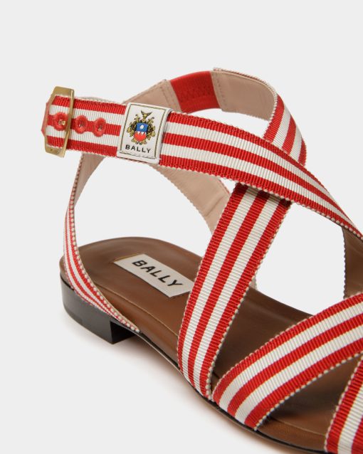 Criss-crossed straps in red and white fabric define the upper of this Sylt flat sandal. A Bally Crest label in leather finishes the ankle strap, positioned to the side of the gold-tone metal buckle.
