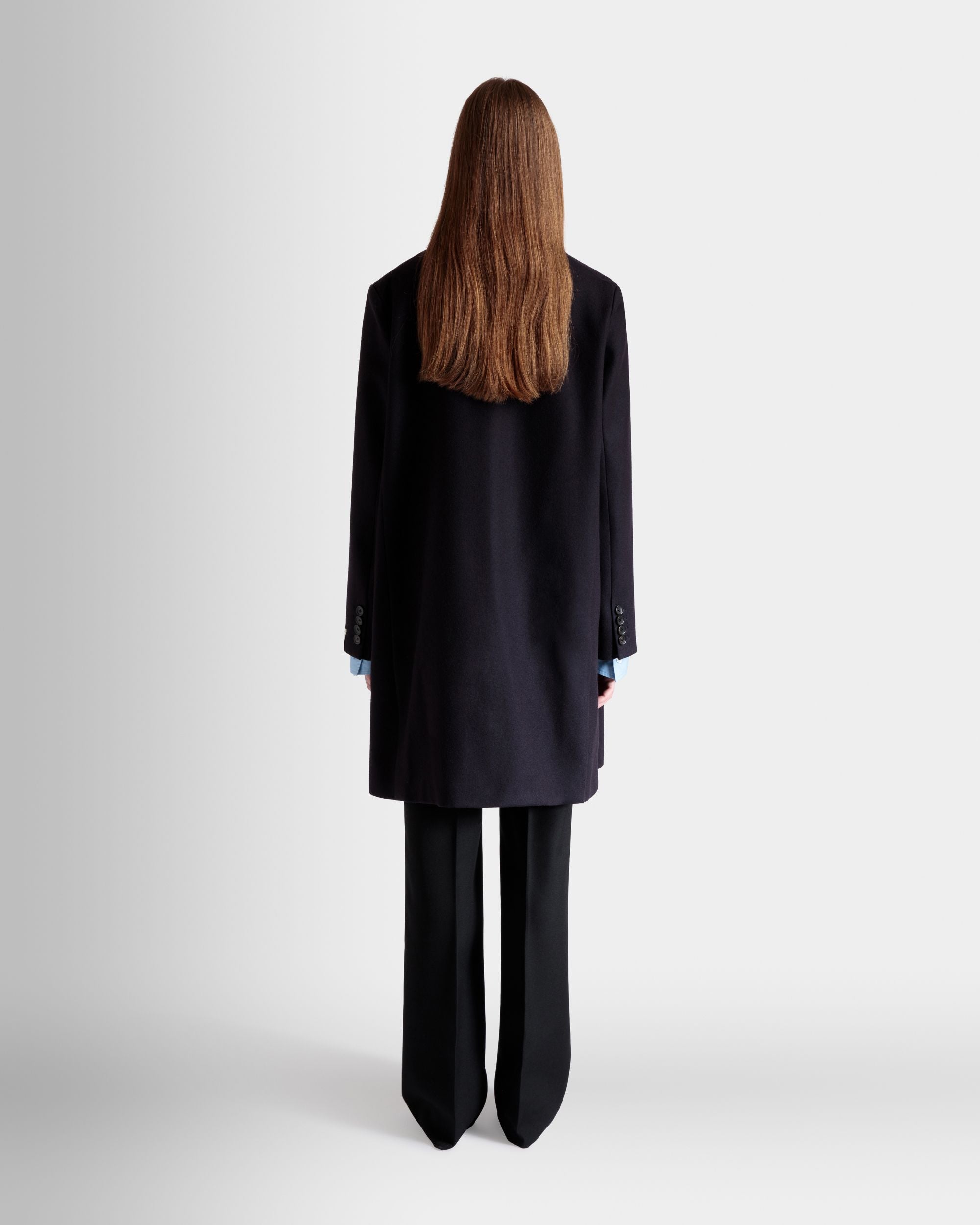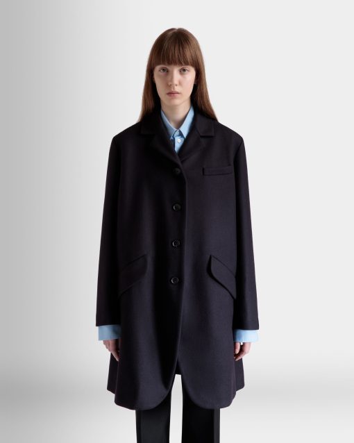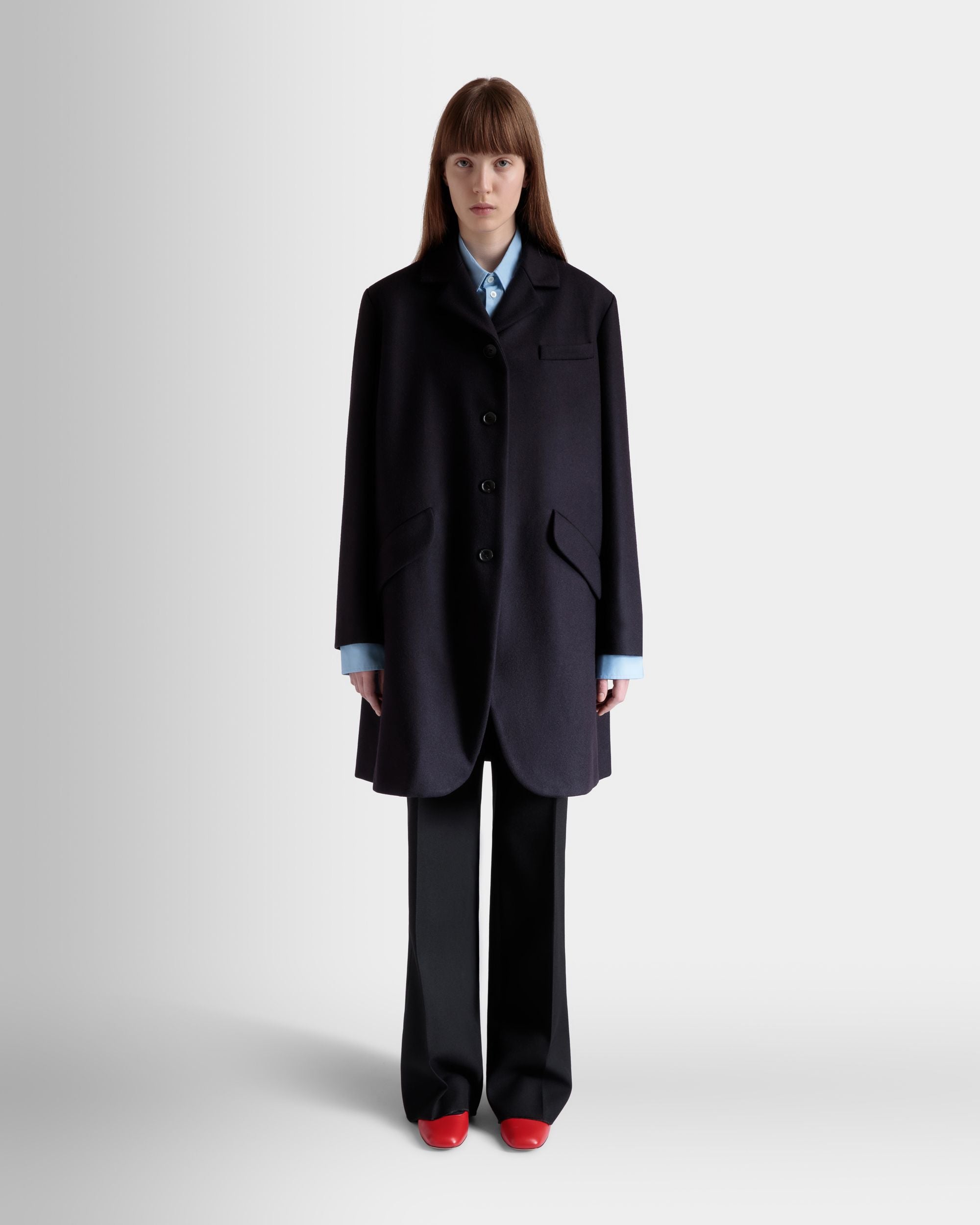 This single-breasted midi coat in a navy blue wool blend has been constructed in an essential silhouette, embellished by horn buttons and multiple pockets at the front. A Crest label is found on one cuff.