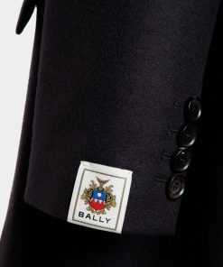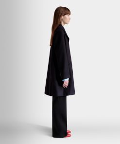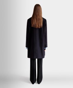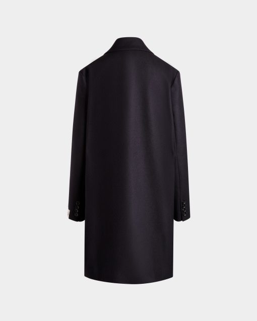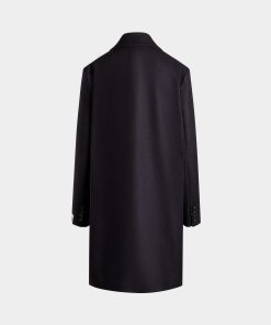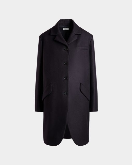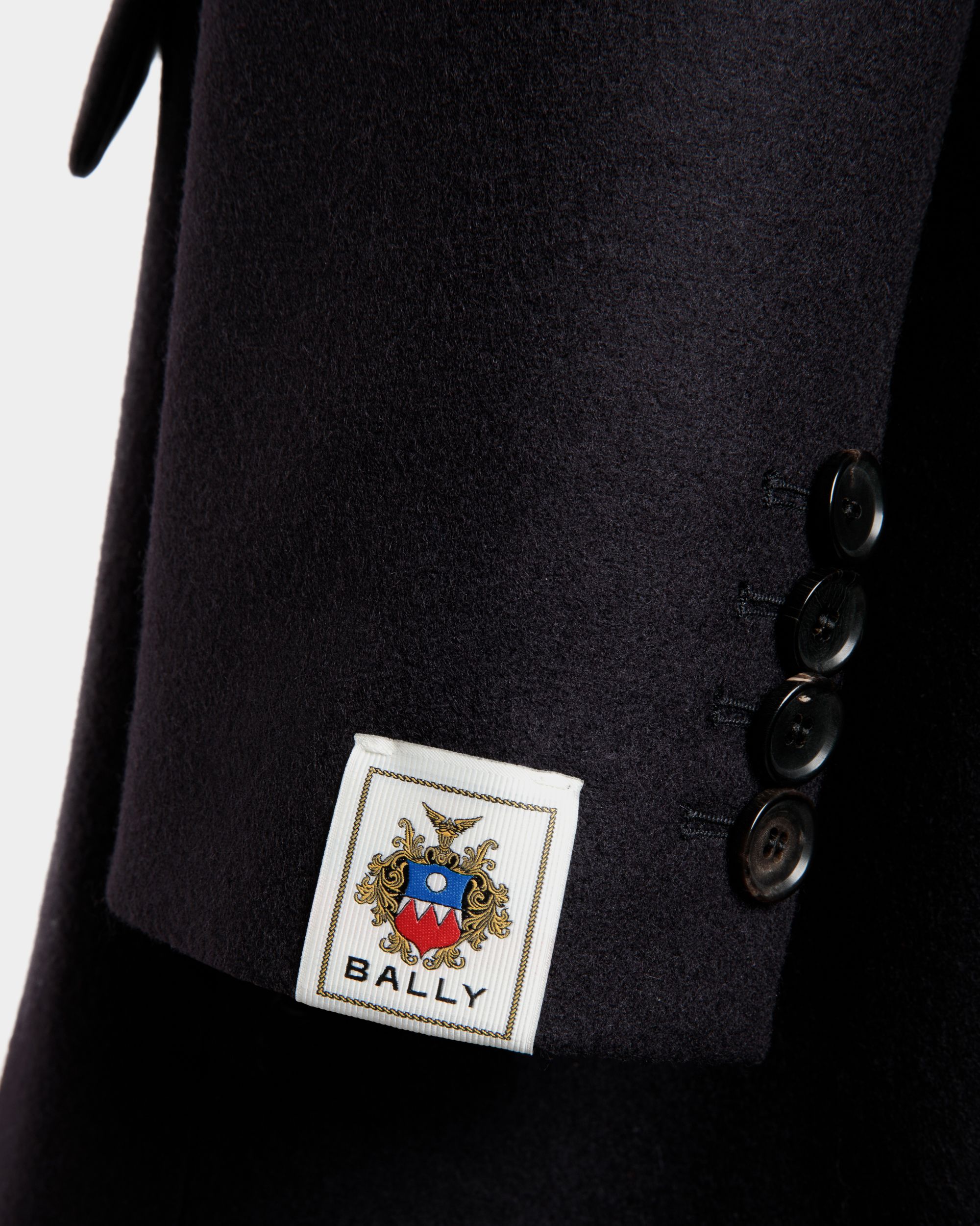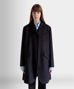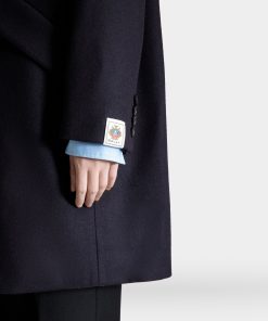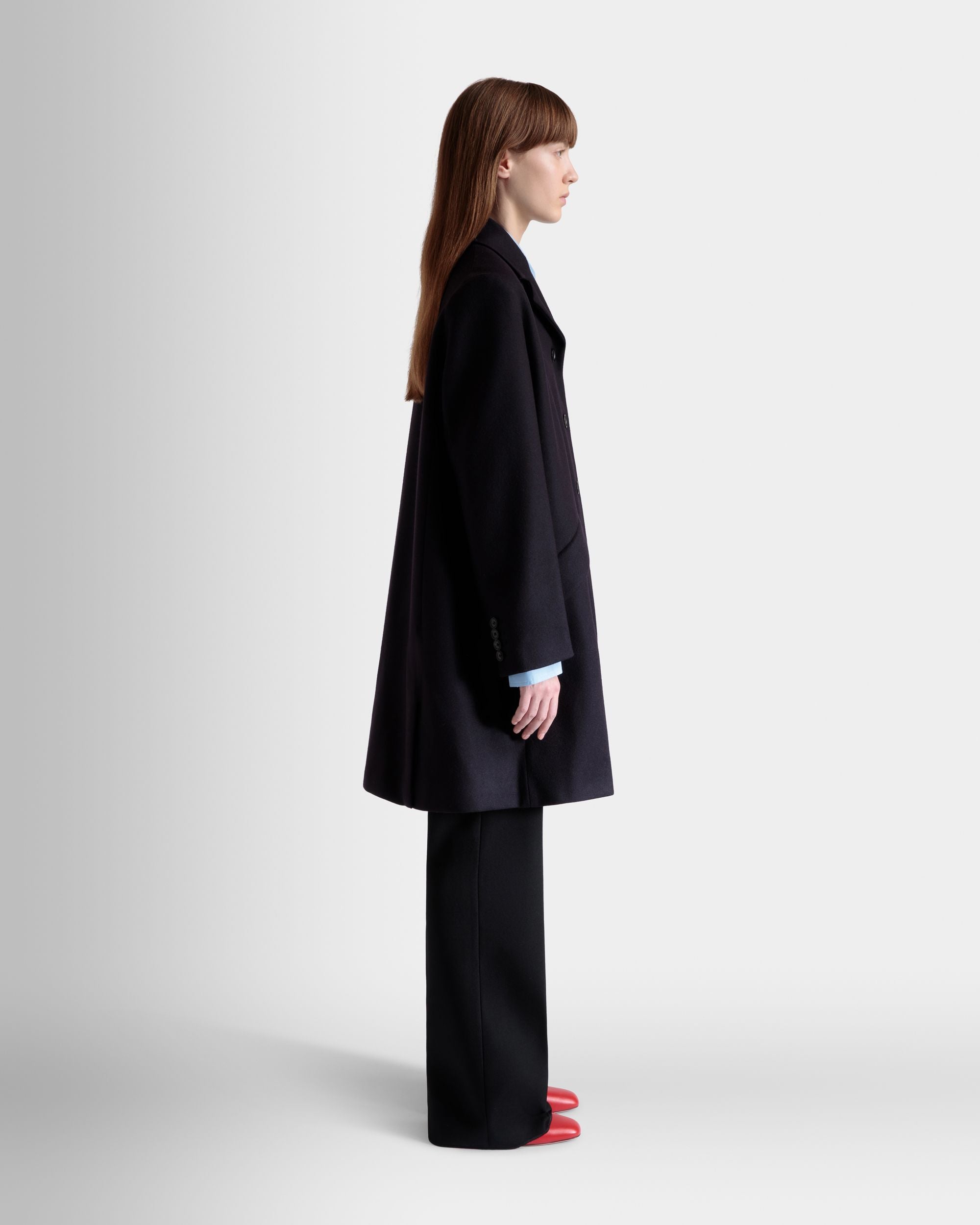 This single-breasted midi coat in a navy blue wool blend has been constructed in an essential silhouette, embellished by horn buttons and multiple pockets at the front. A Crest label is found on one cuff.