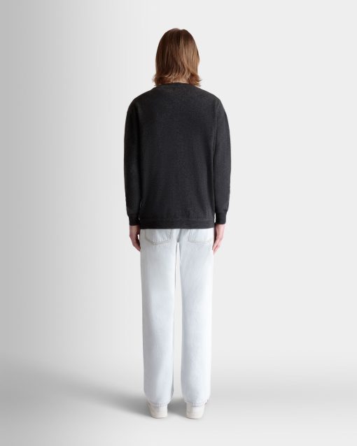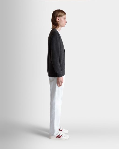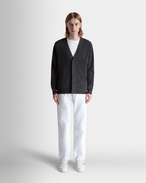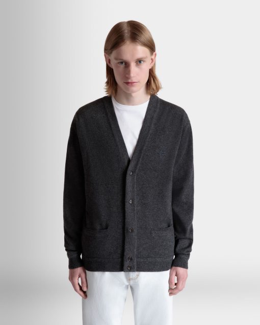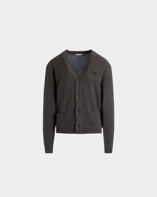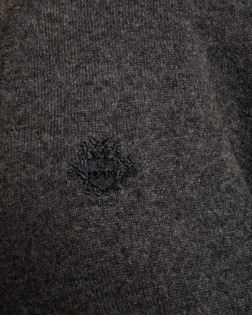 This dark grey cardigan is knitted in fine cashmere and trimmed by Bally Crest embroidery. Horn-effect resin buttons and two pockets finish the front.