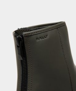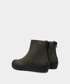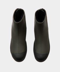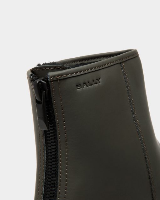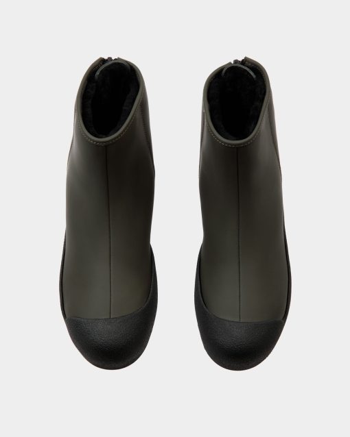 Inspired by an archival design for the Swiss Olympic team, this Curling bootie in military green rubberized leather is engineered for insulation, comfort and maximum stability. A practical zipper fastens the back.