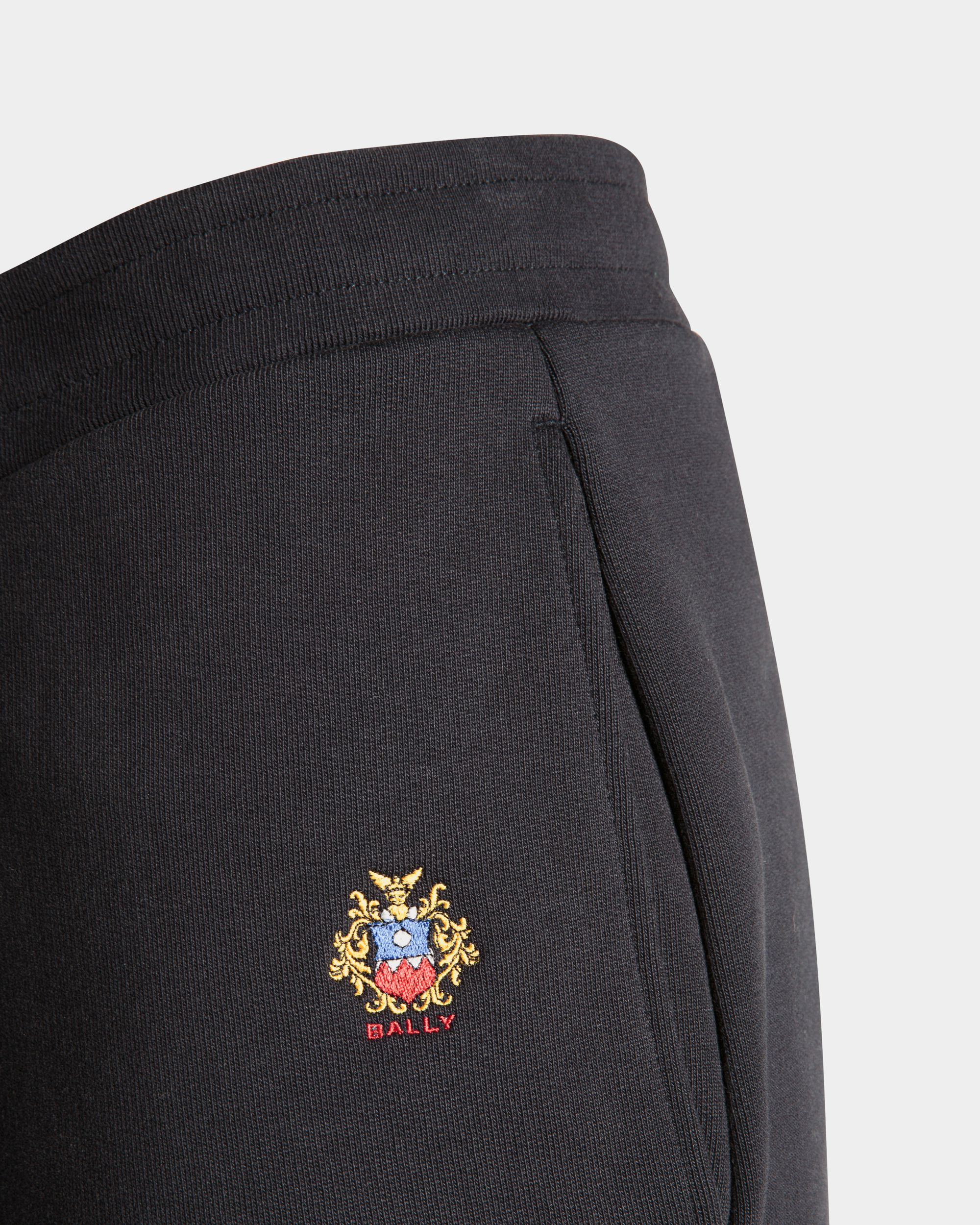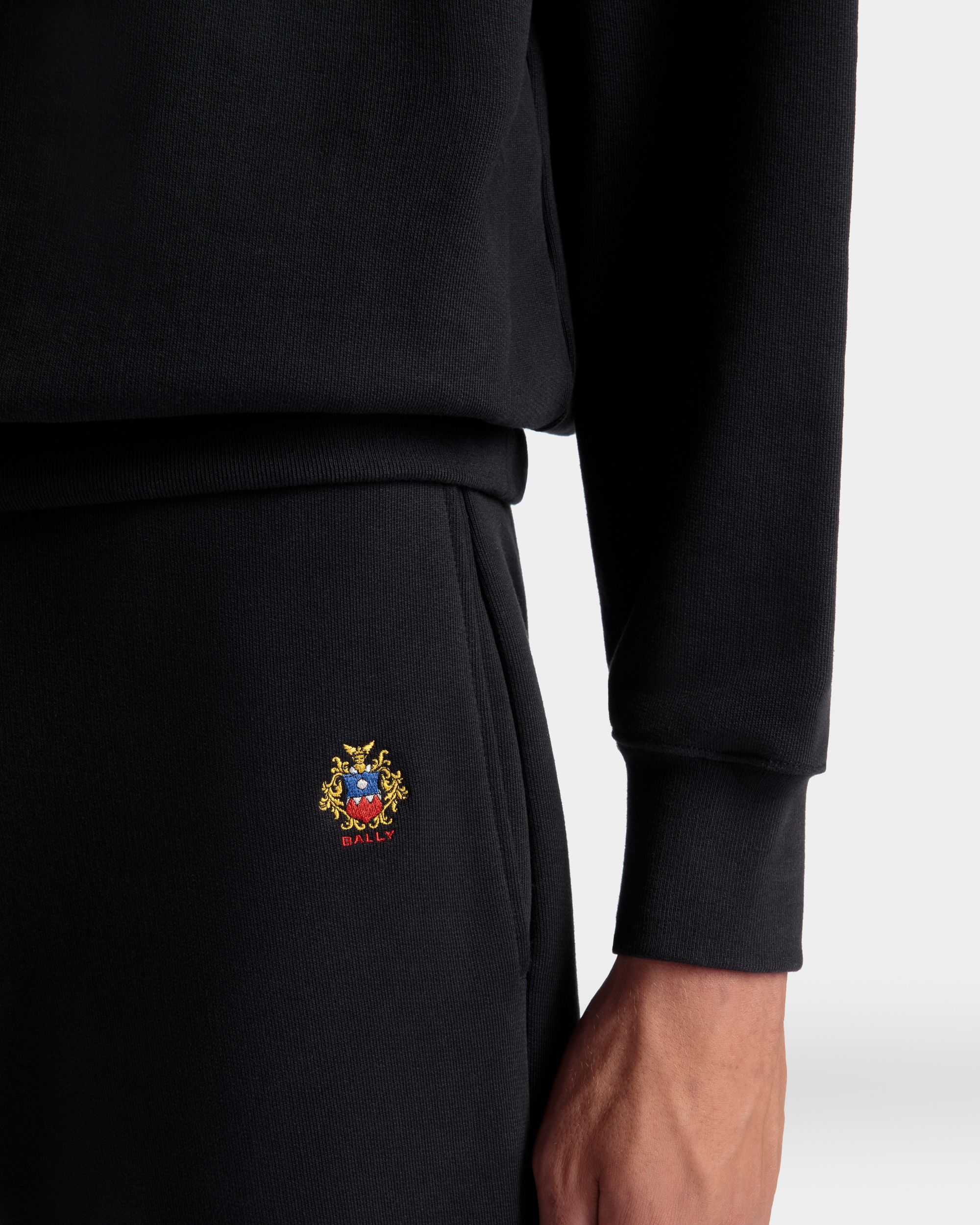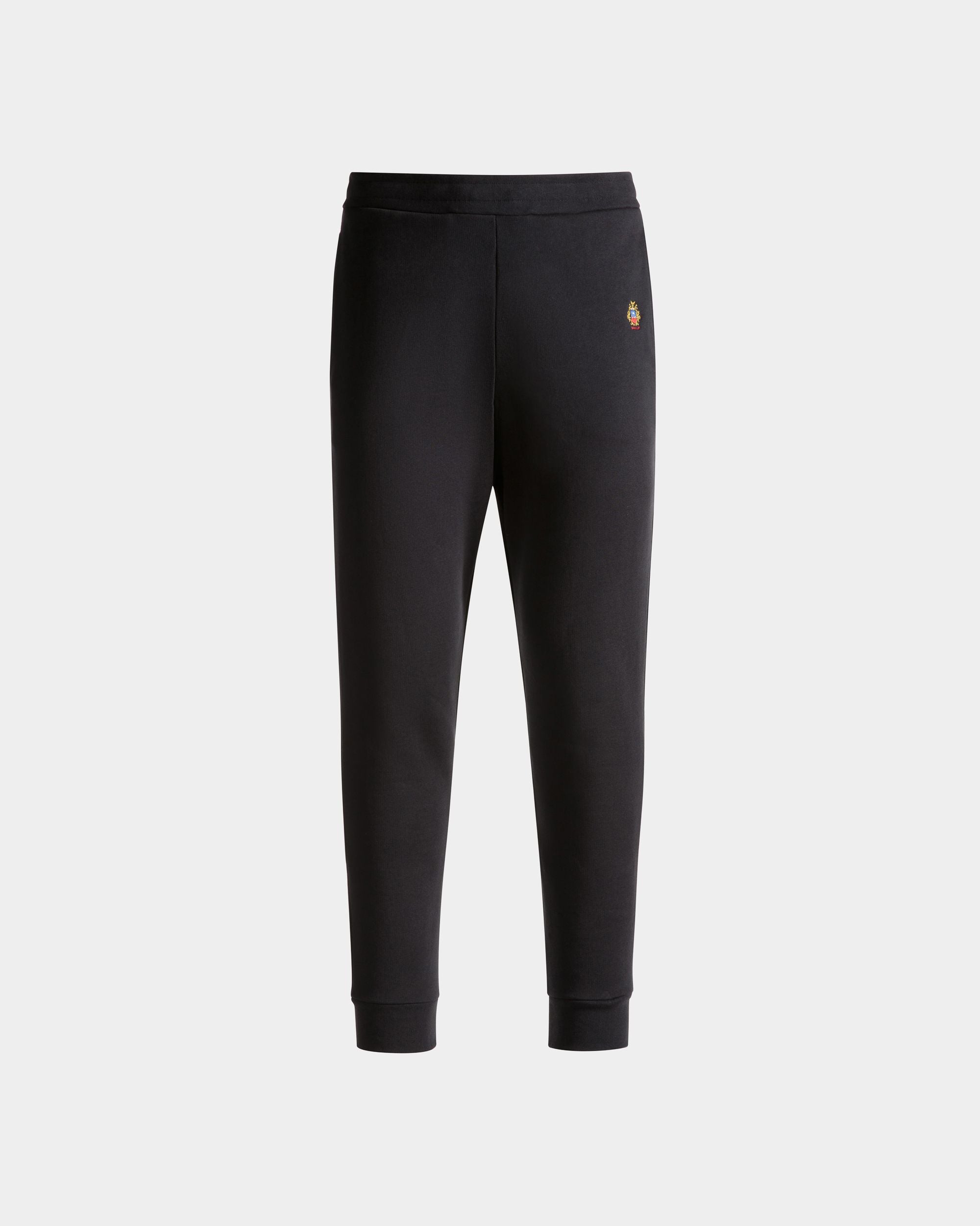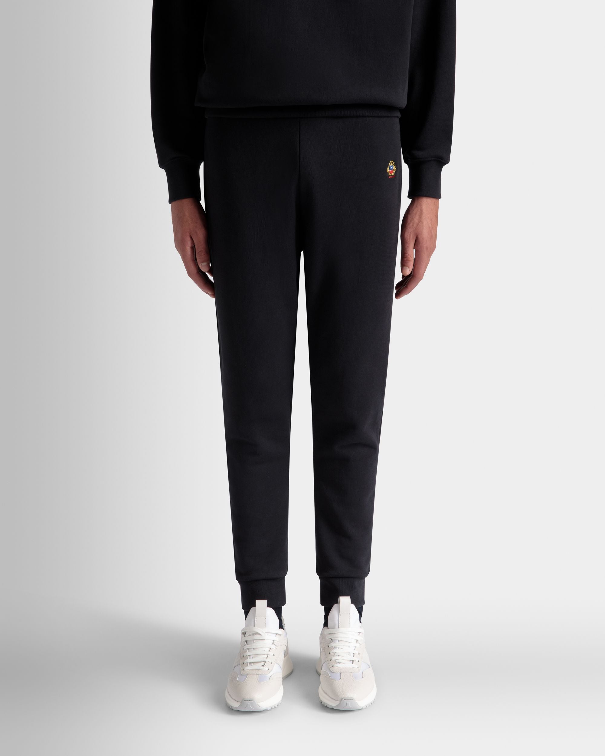 In soft knit cotton, these sweatpants are decorated by a finely embroidered Bally Crest on one hip and cuffs at the ankles. Two inset pockets are found at the hips, plus one patch pocket at the back.