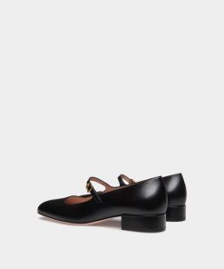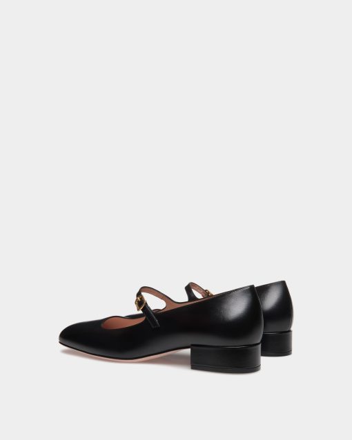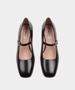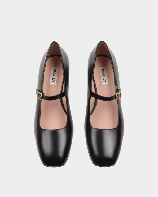 In black leather, this Ballyrina pump reimagines a classic ballet silhouette with a square toe and a block heel. A metal buckle inspired by hardware from the Bally archives fastens the Mary Jane strap.