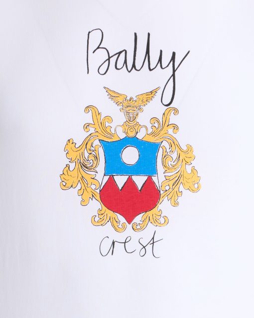 The front of this short-sleeve white cotton t-shirt is emblazoned with a large multicolor Bally Crest print, a signifier of the brand’s heritage.
